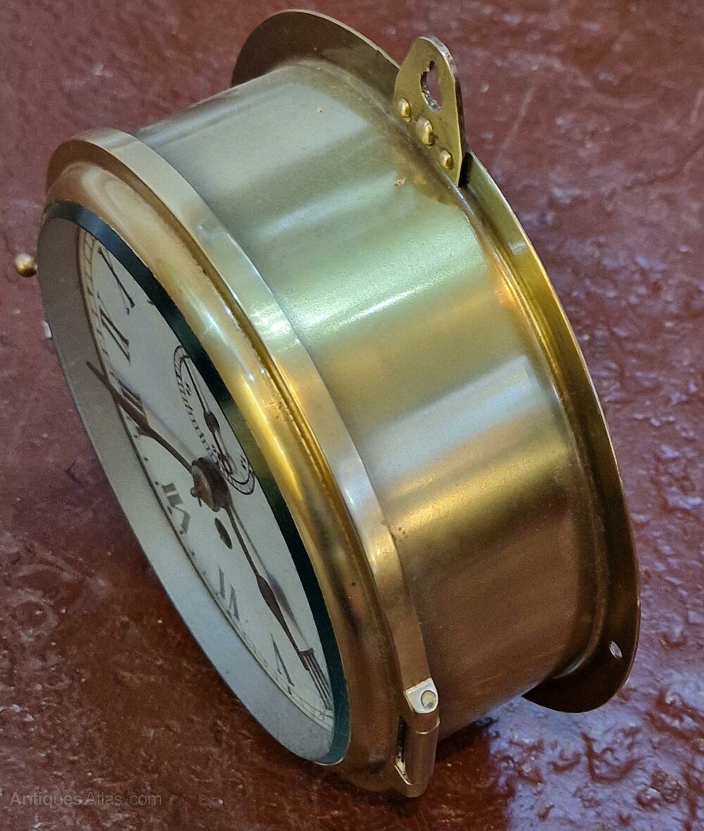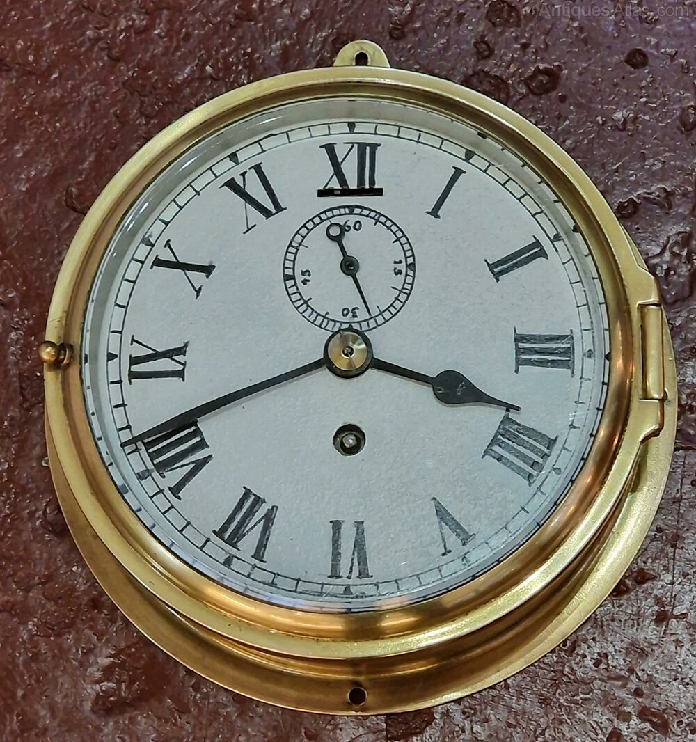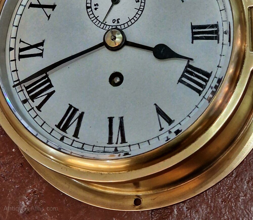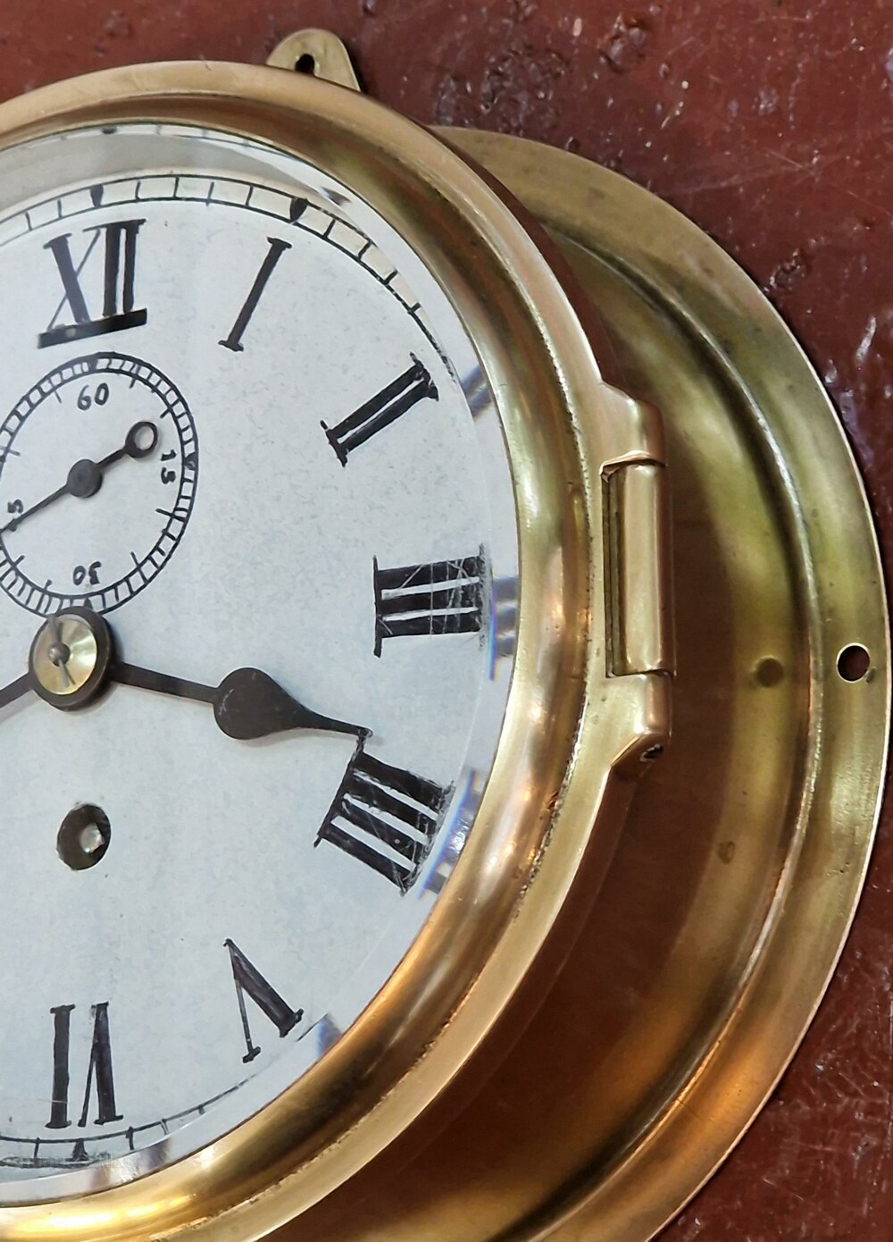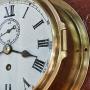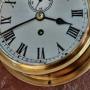 A small, Smiths Empire ships bulkhead clock. Bevelled glass to the opening front bezel. A good quality brass case. A 6" painted dial with a subsidiary seconds hand. A 7-day timepiece mechanism signed Empire. Circa 1950.