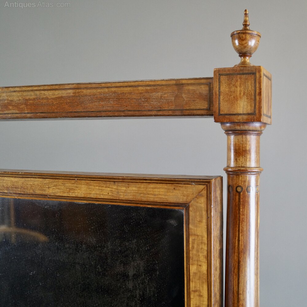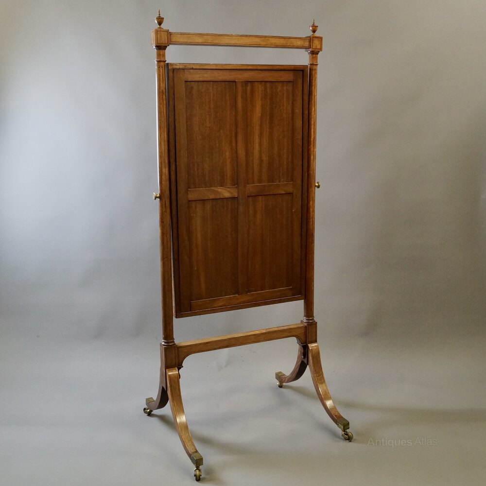A Superb Sheraton Satinwood Cheval Mirror. In exceptionally good and original condition, with an untouched colour and patina. The mirror stands on sabre legs with brass castors and has turned supports, topped with finials, which are united by stretchers and within is the original looking glass. The whole is beautifully inlaid with boxwood, ebony and Partridge wood stringing. 1690mm high, 710mm wide and 610mm deep. English. Circa 1795.
