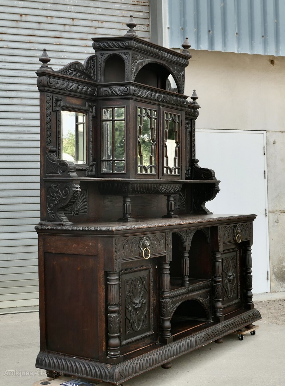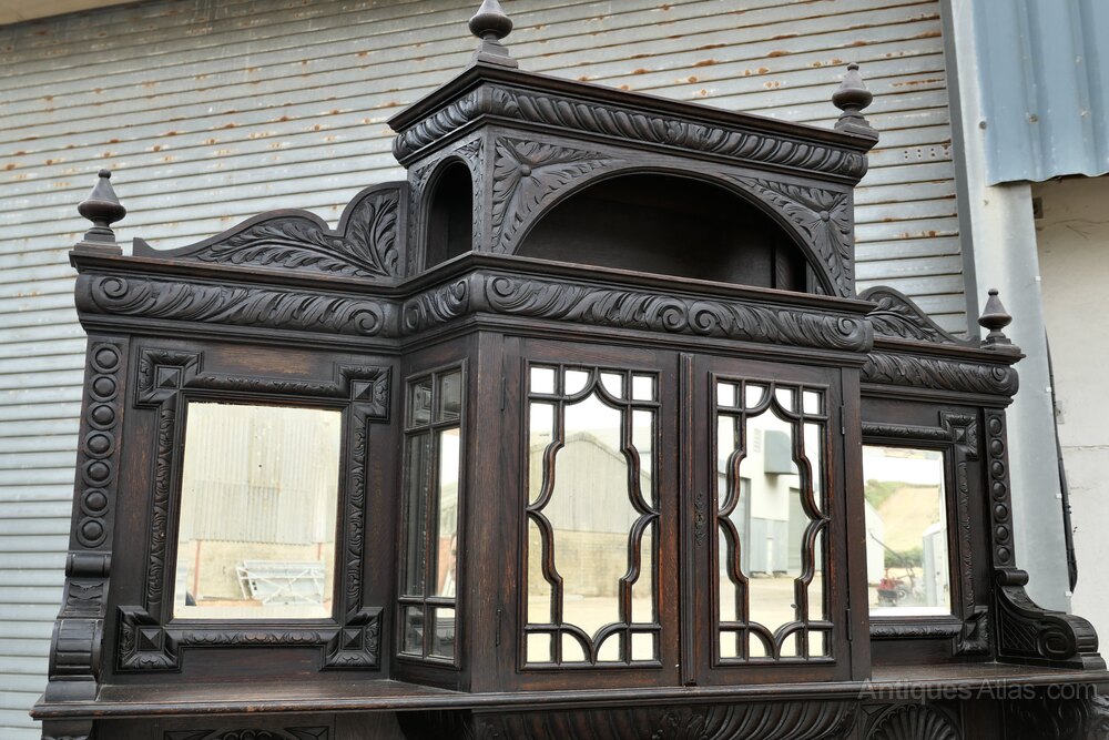 The dresser base has 2 large cupboards with drawers above on either side of a central shelved area with arched enclosures. On the top there are 2 mirrors on either side of a 2 door mirrored cupboard.