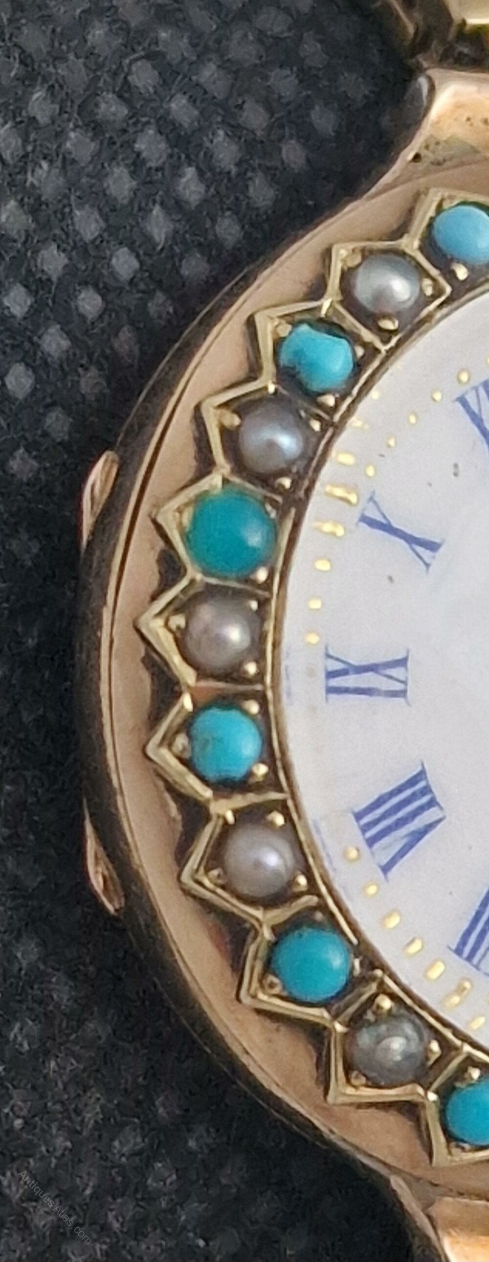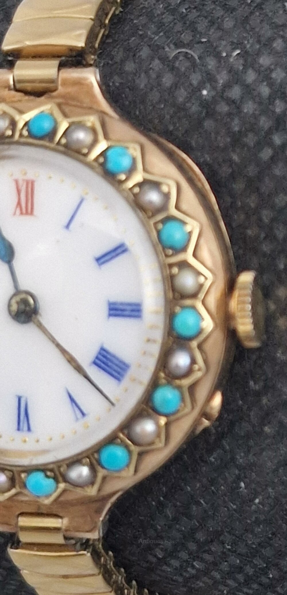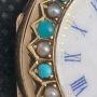 A late Victorian ladies 9k gold wristwatch. This is a very early example with a narrow, flexible strap. A lovely bezel with alternating turquoise and seed pearl decorations in recessed settings. An enamel dial with blue Roman numerals and red at 12 o'clock. Blued steel hands.