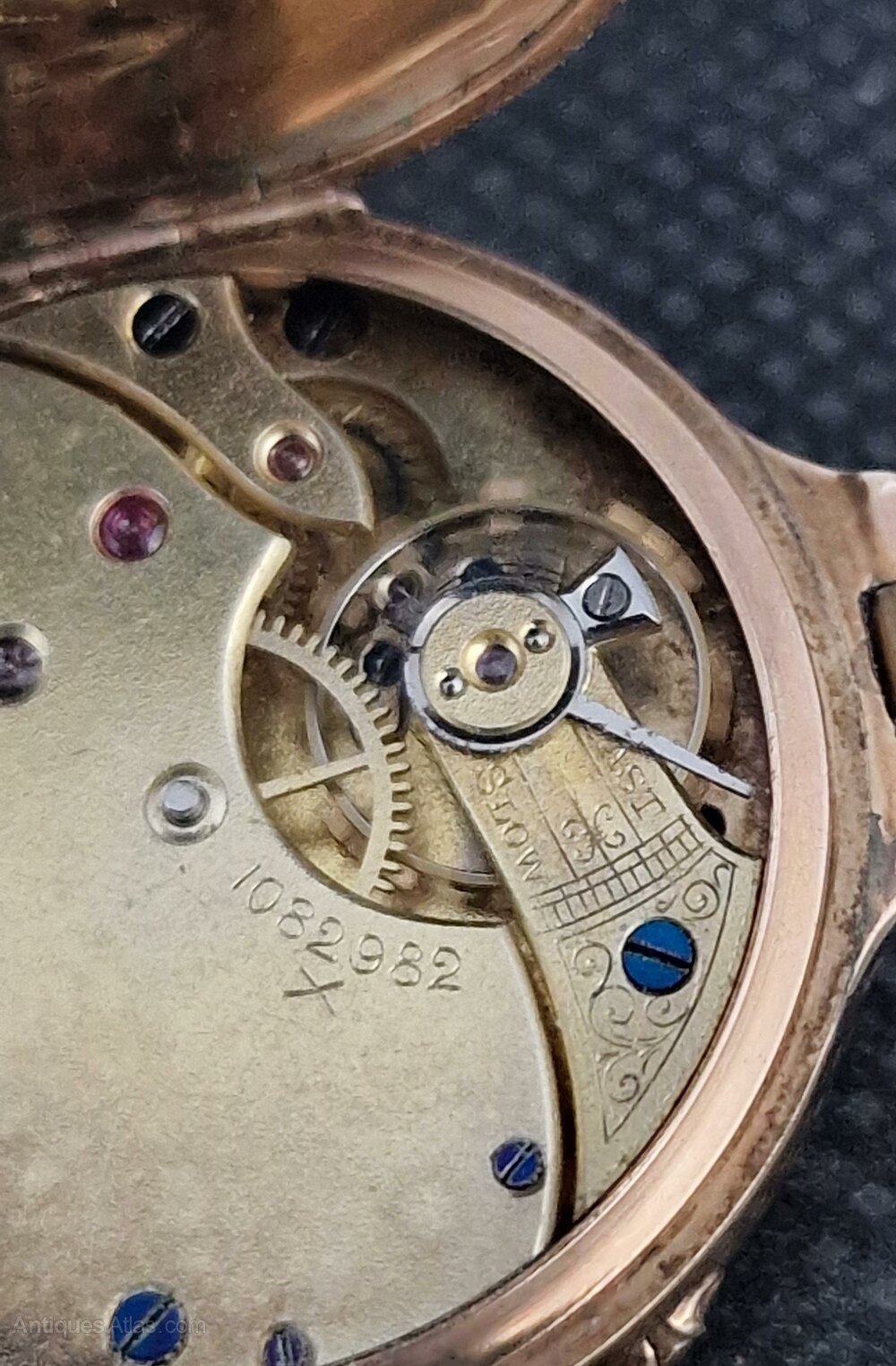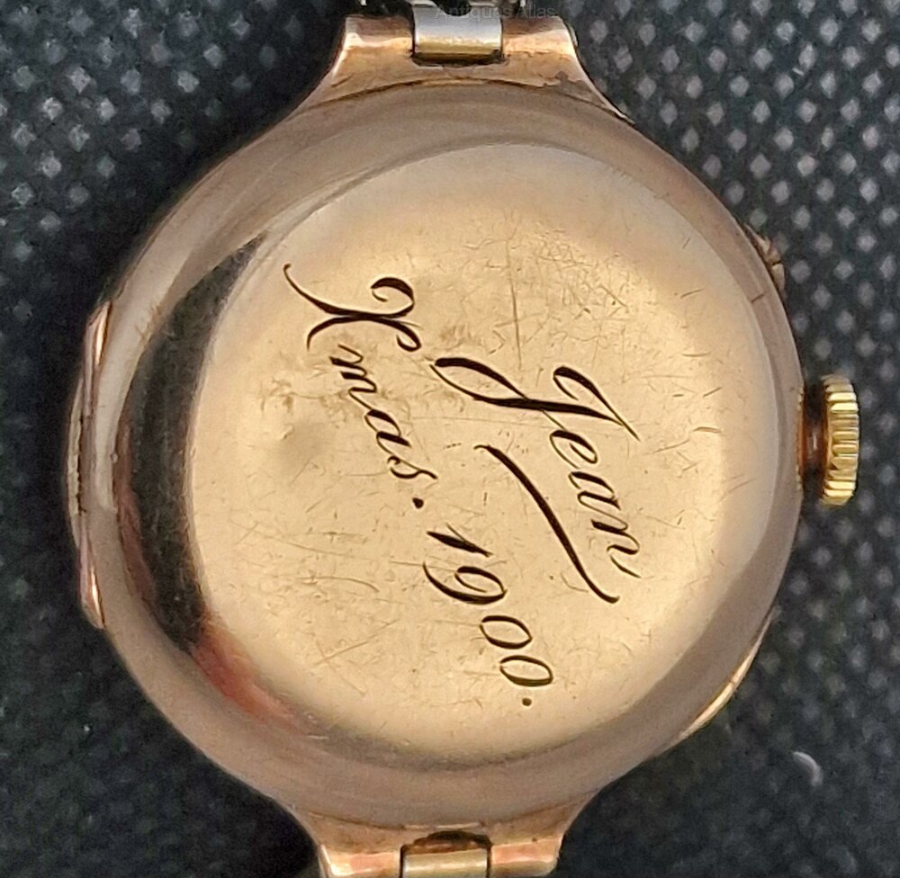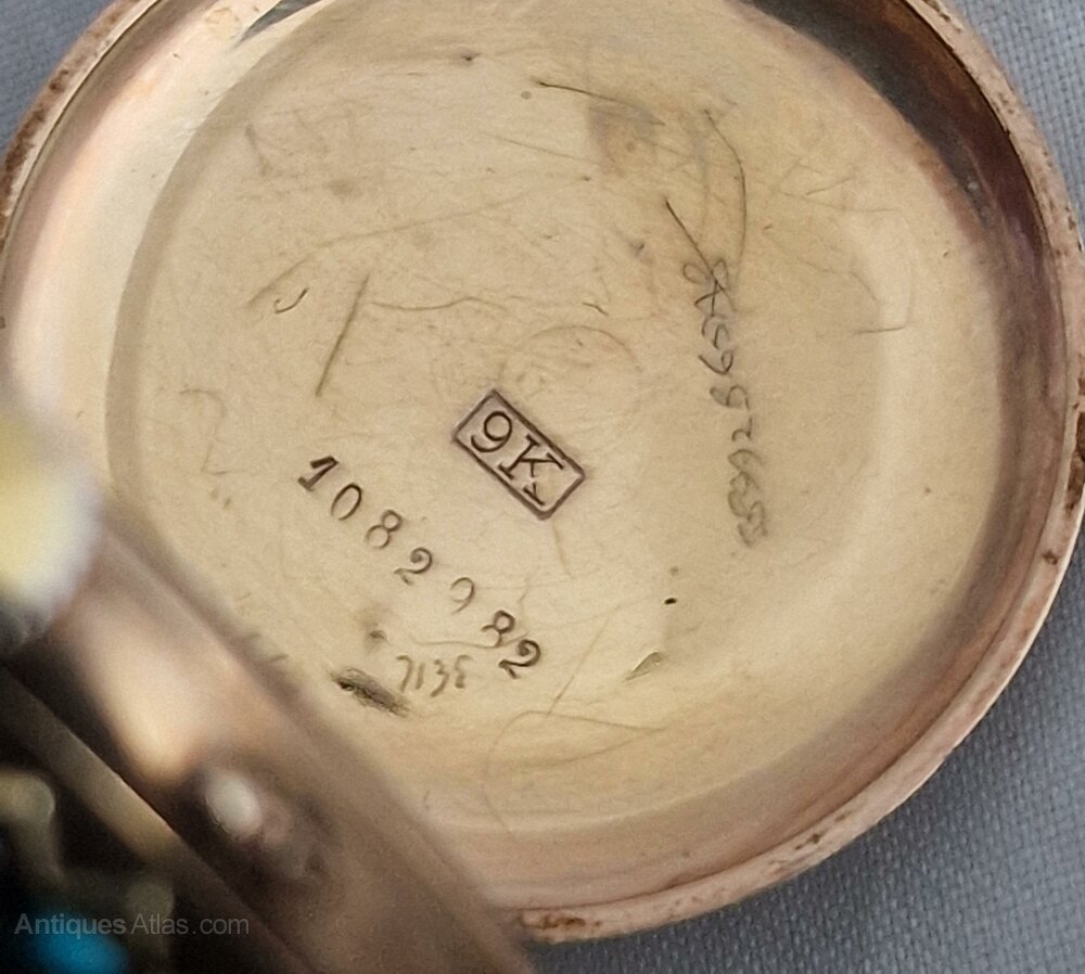 A Swiss mechanism with a lever escapement. The case inner is marked 9K with serial numbers. The case rear is engraved 'Jean Xmas 1900'