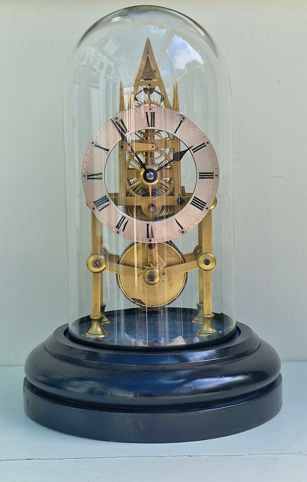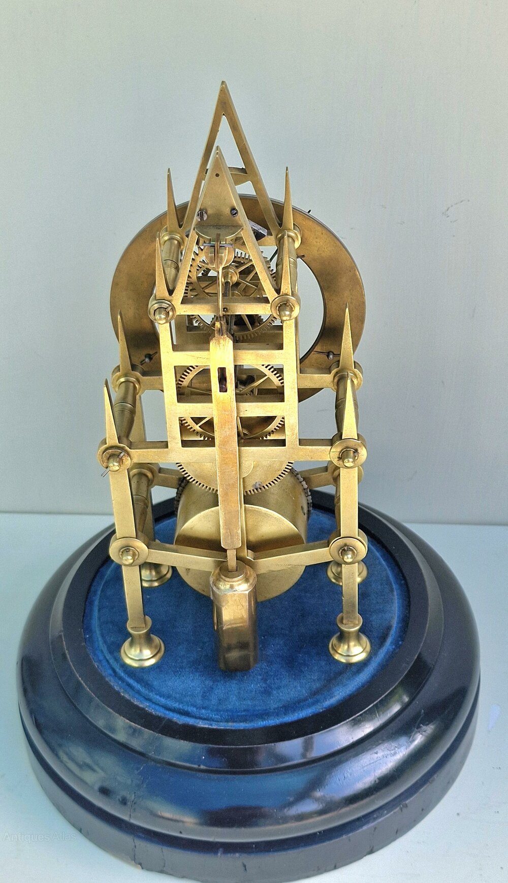 A good quality English Victorian period skeleton clock. An original glass dome to the stepped, ebonised and blue silk base. A silvered dial with Roman numerals. Blued steel hands.