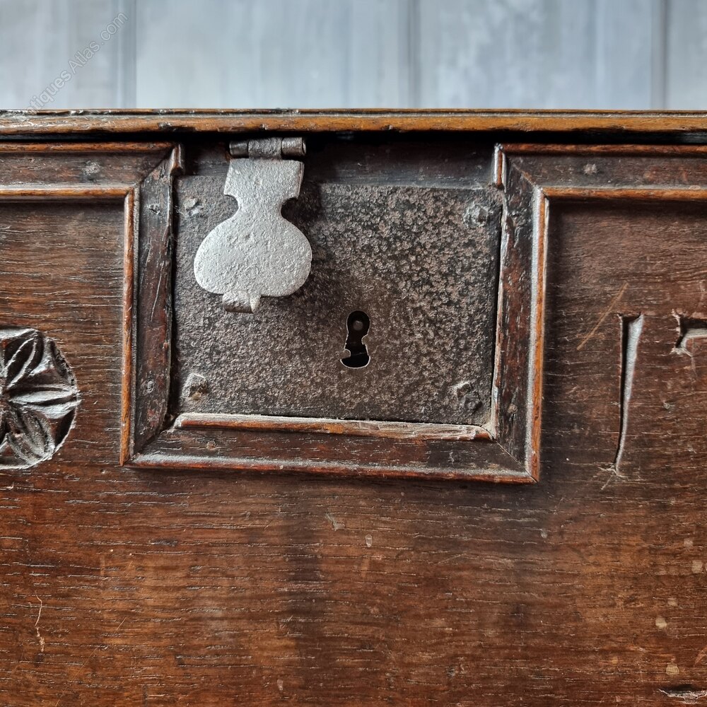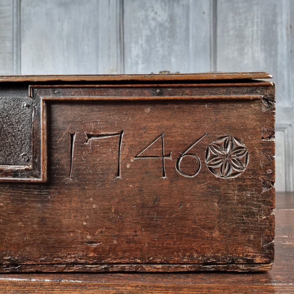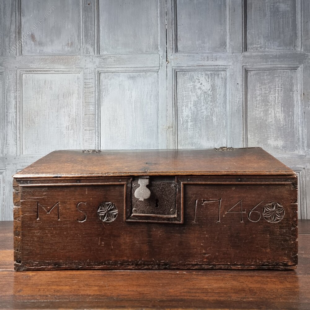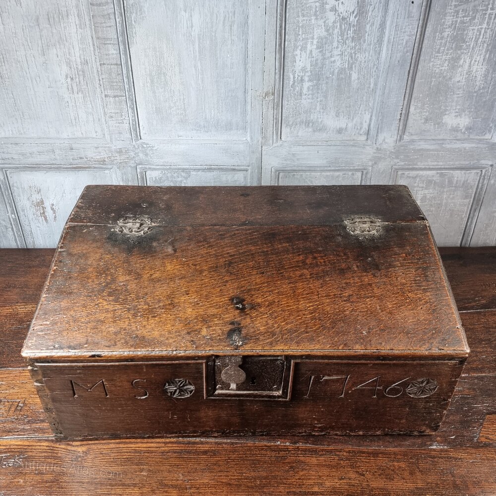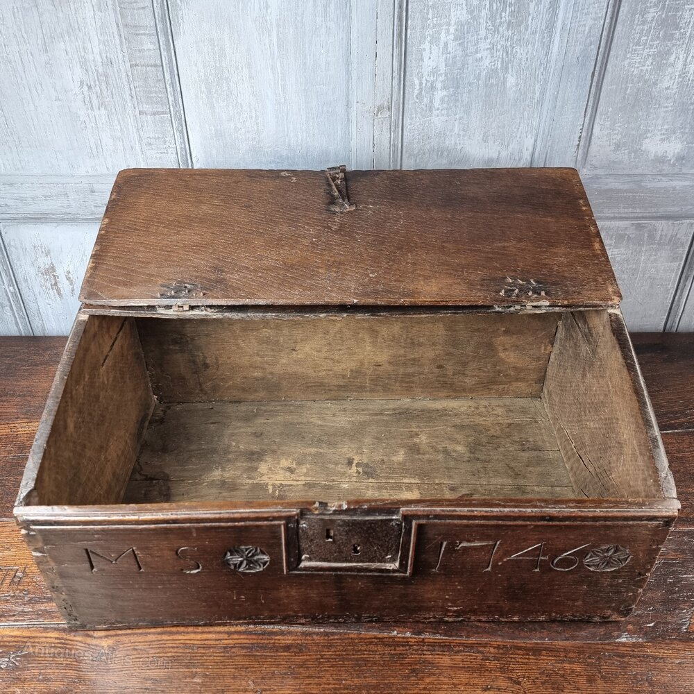 An 18th century oak desk box of superb colour and patination. The box retains its original lock and hasp and has the owners initials carved in the from M.S with the date 1746 and teo chip carved rosettes.