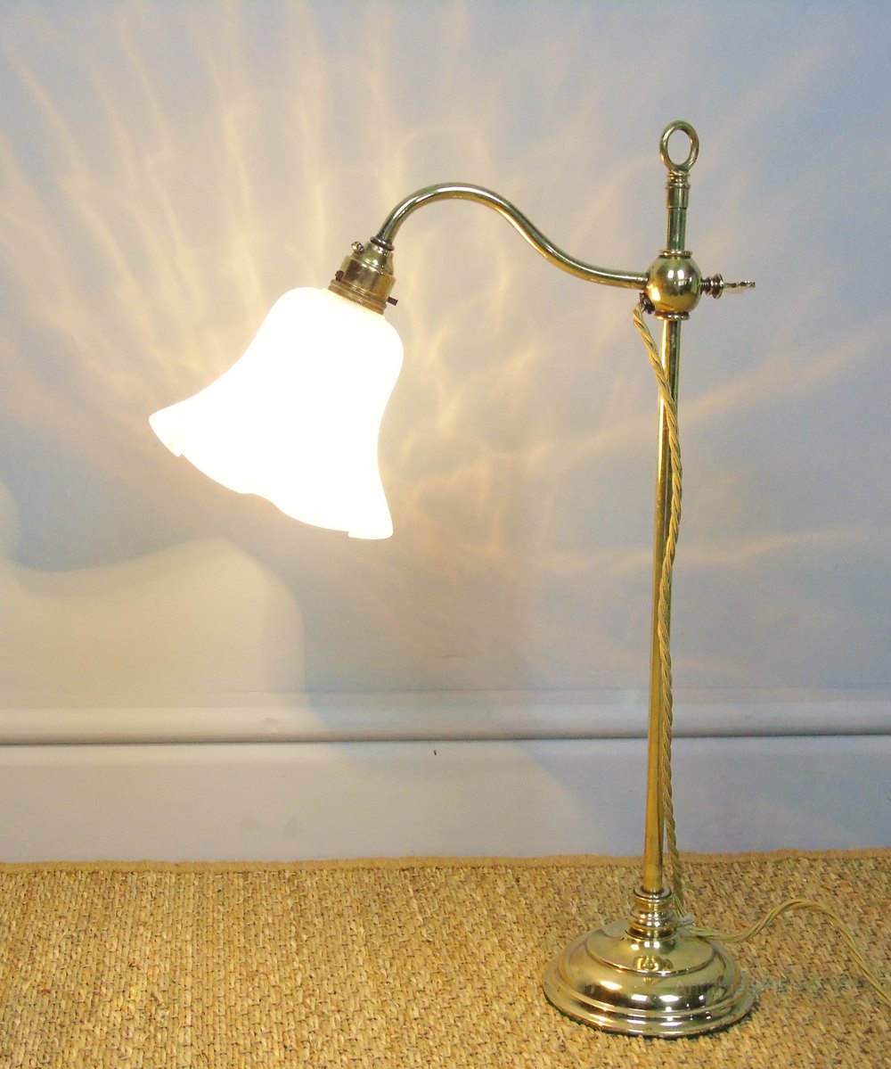 This is a very attractive brass rise and fall action, desk or table lamp dating from around 1920. The lamp is in excellent condition, fully restored and rewired with modern antique style braided cable. It has been PAT tested and is ready for use.