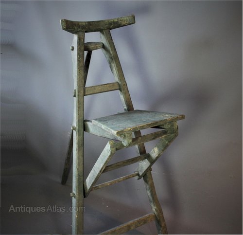 Antique Artists seat . Folds away. Painted finish, curved top support, single pole to back. Measures 115 cm high x 34 cm wide (top) 55 cm (base) variable depth