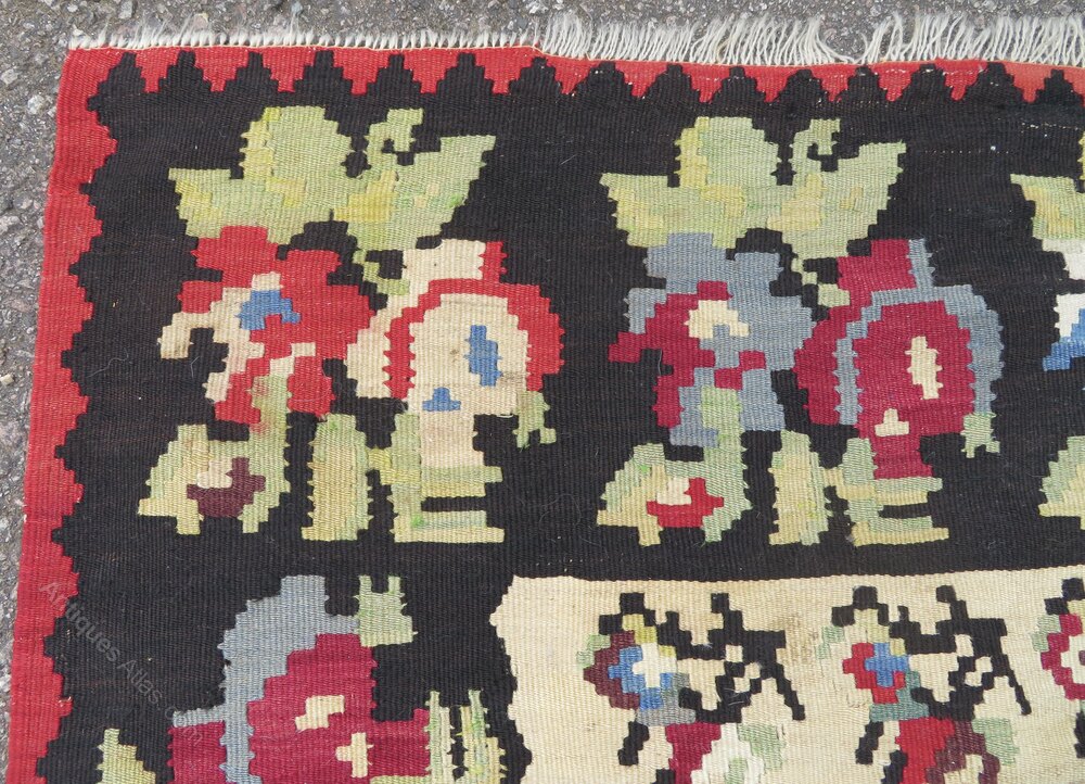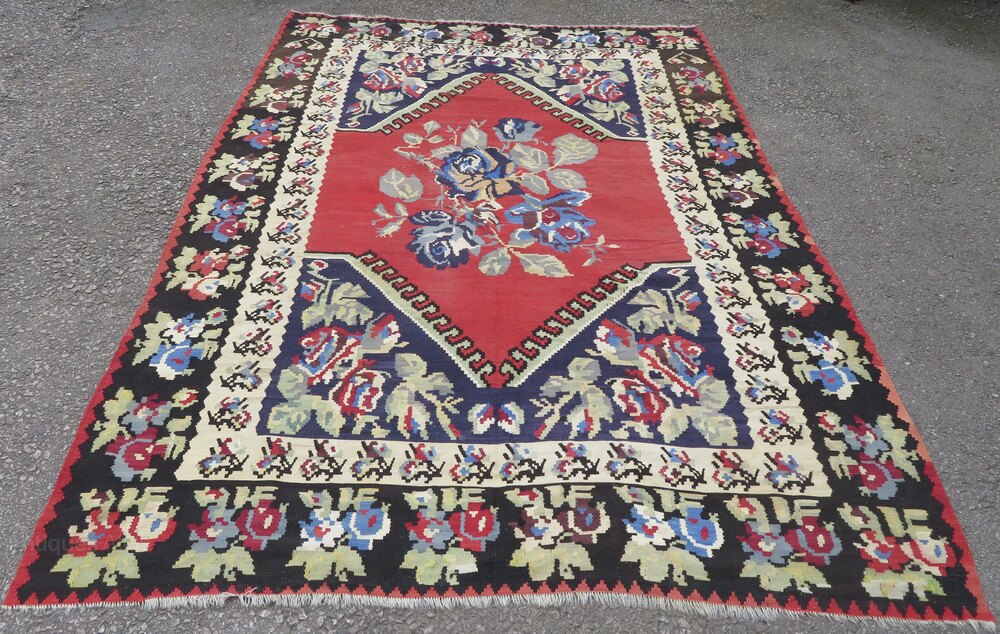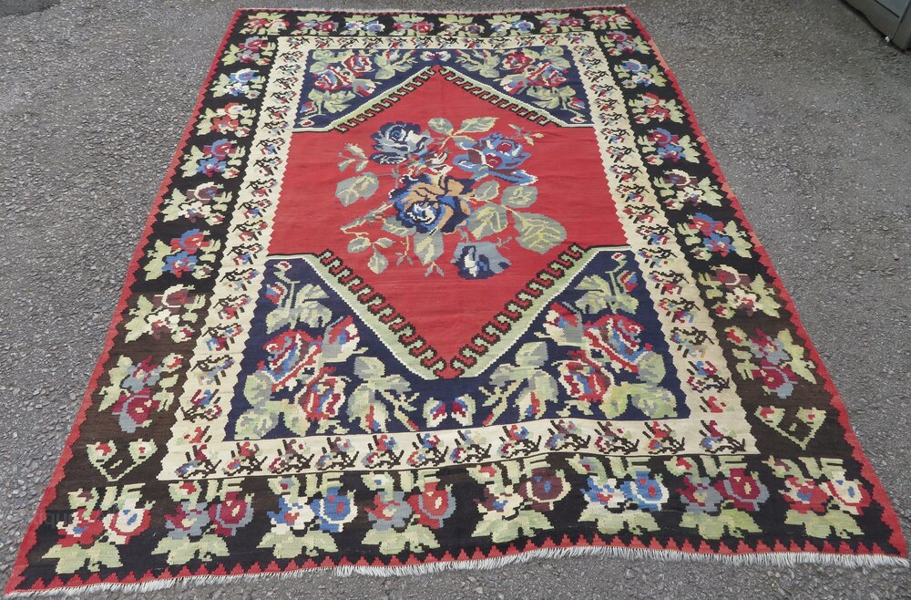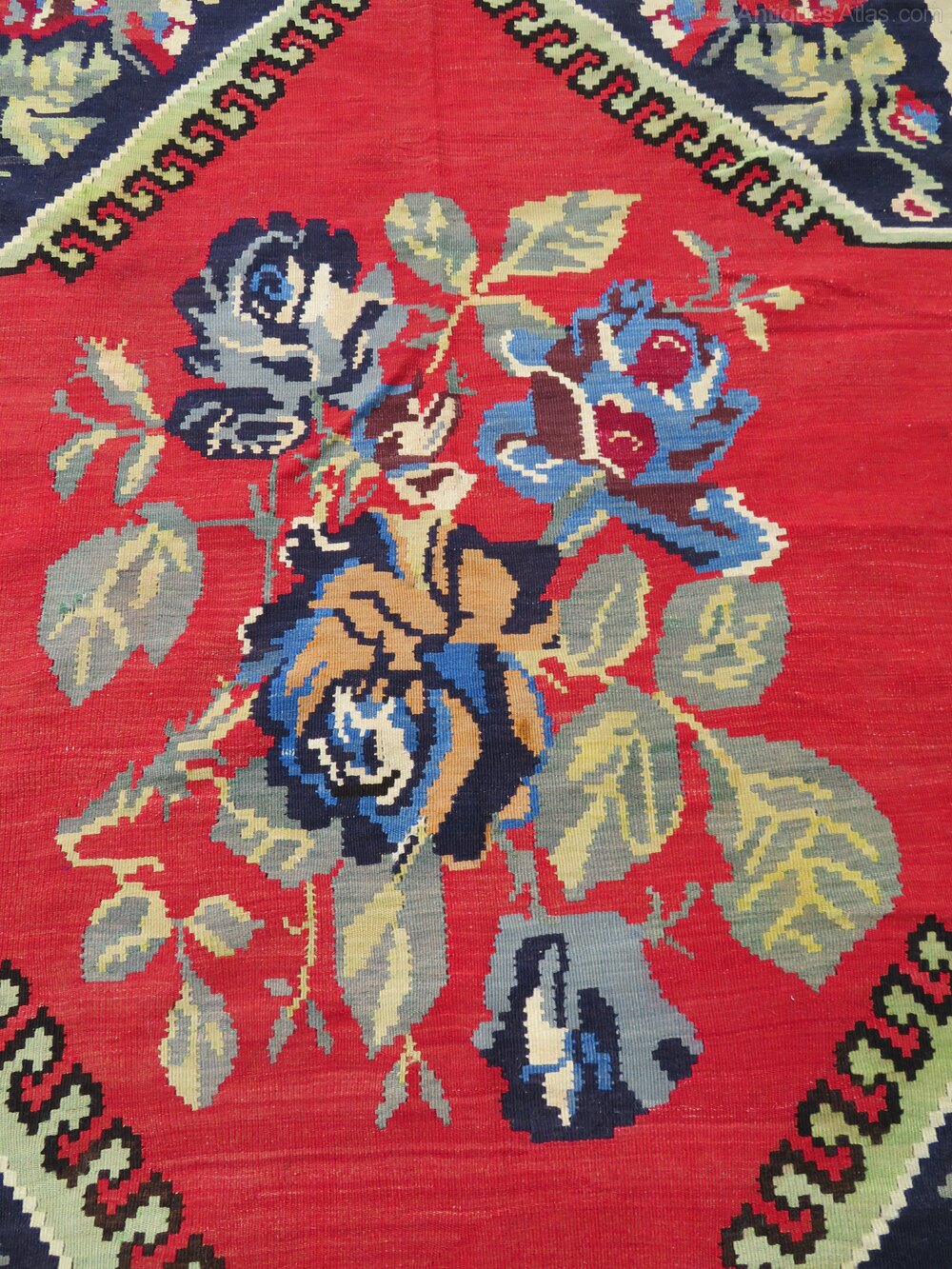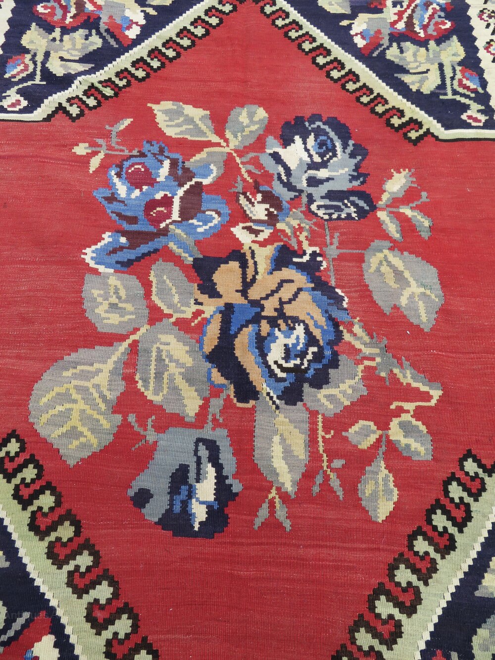 In beautiful condition throughout is this early 20th century bessarabian kilim of carpet size as well. With a european rose/cabbage pattern. Images of both sides taken with no holes,reweaves and all ends and sides secure. All wool flat woven construction. The cheapest priced and largest bessarabian kilim offered for sale on here. Not 10k,not 3k just £1450 gbp. Size is 10 foot 8 inches by 7 foot 5 inches. 325cm X 226cm. At widest points. Fringes not measured in size. U. K post £25. Many more bargain antique rugs & carpets offered for sale. Ktr 245