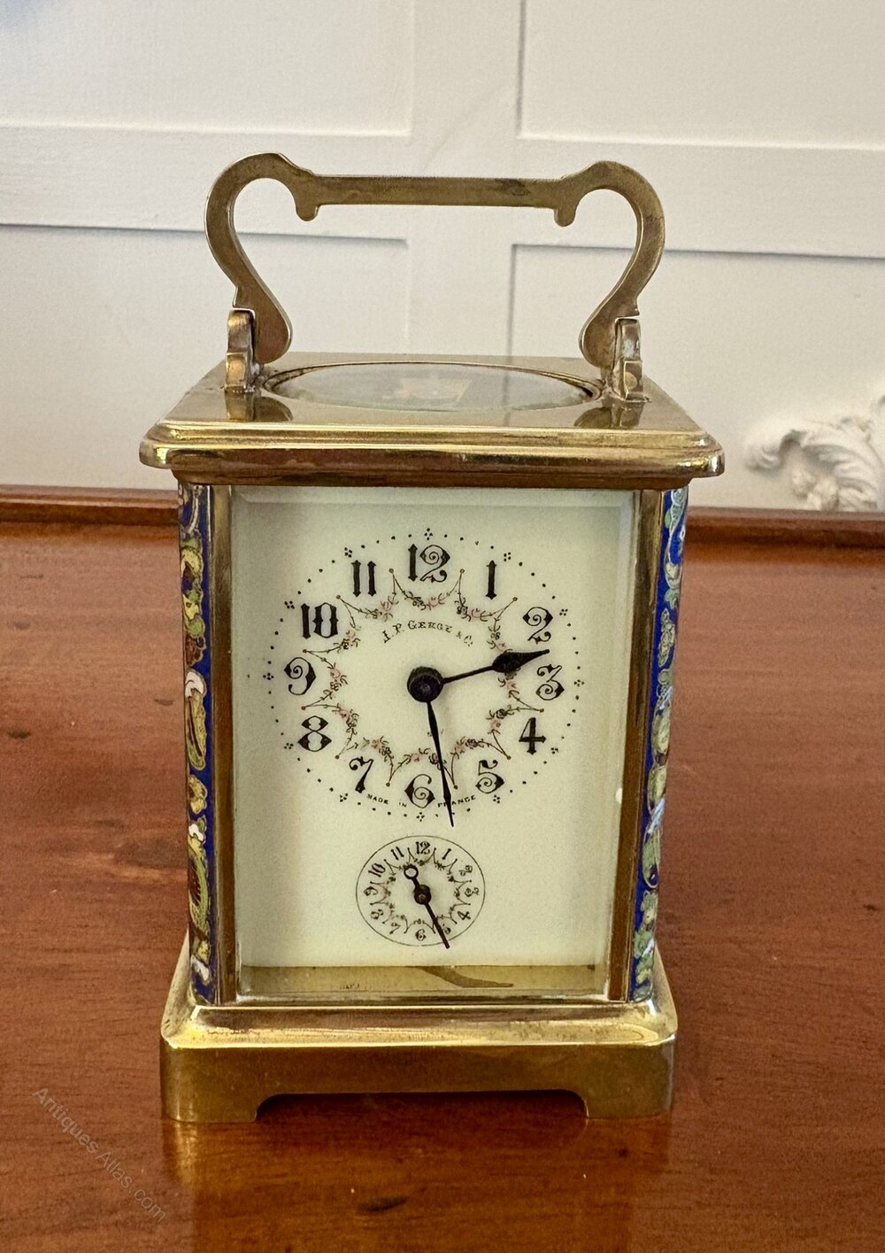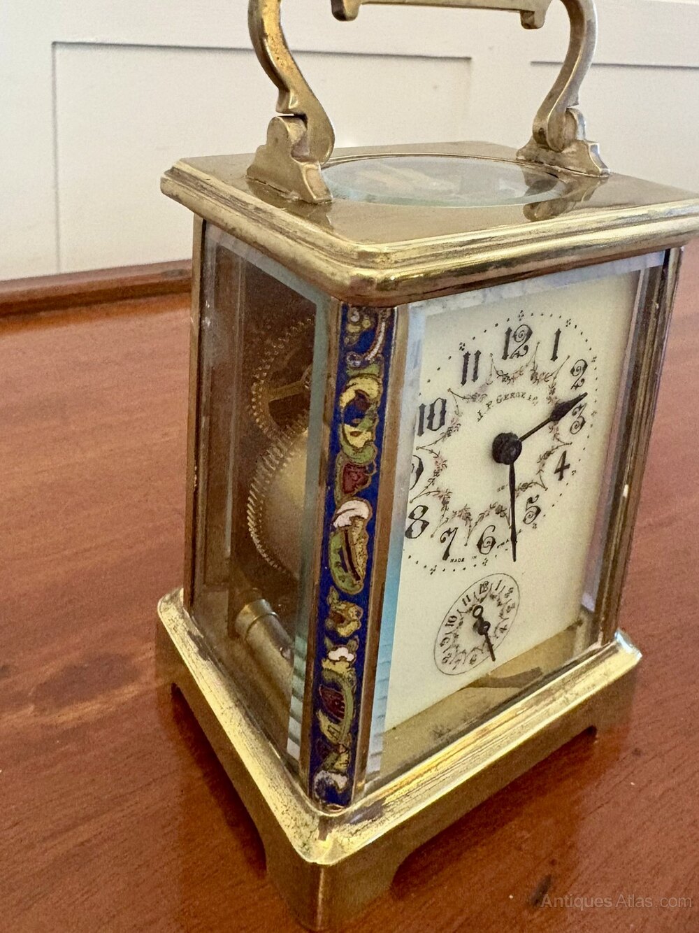 Antique Edwardian quality brass and champleve enamelled carriage clock having a quality brass case with bevelled edge glass and champleve enamelled corners, enamel dial with original hands and subsidiary alarm dial, 8 day movement.