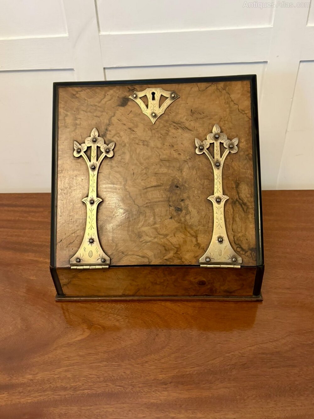 Unusual Antique Victorian quality burr walnut brass mounted stationery box