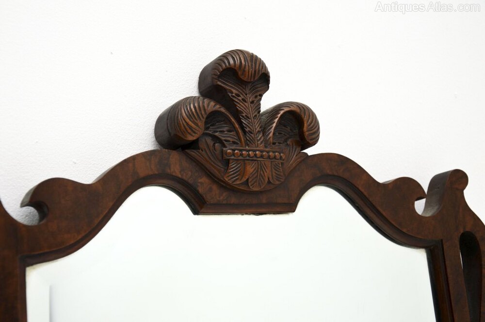It is of superb quality, with stunning burr walnut grain patterns and a bevelled glass mirror. The top section has beautiful and intricately carved Prince of Wales feathers. The overall shape is lovely, with pierced fretwork on the upper corners and lower edge. This is a lovely and versatile size to be used in various settings around the home.
