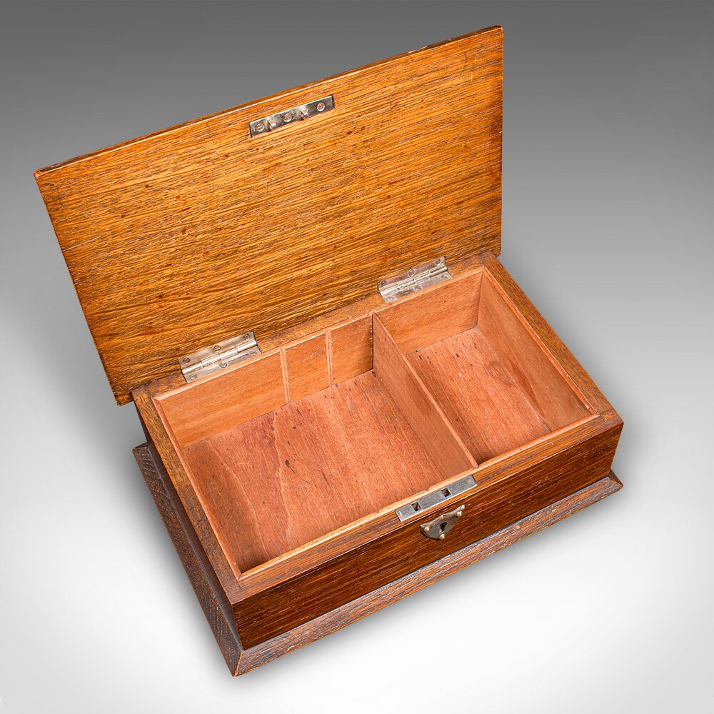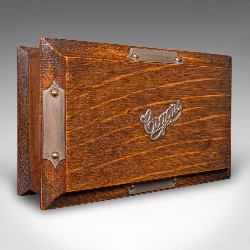 This is a superb antique cigar case. An English, oak and cedar-lined desktop humidor, dating to the Edwardian period, circa 1910. A handsome collector's piece offering excellent storage and rich visual appeal.