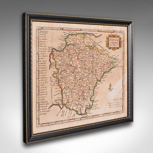 This is a small antique map of Devonshire, an English framed cartographic engraving by Robert Morden, dating to the early Georgian period, circa 1720. A charming and historically rich representation of the county, this hand-coloured engraving captures the elegance of early 18th century mapmaking.