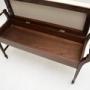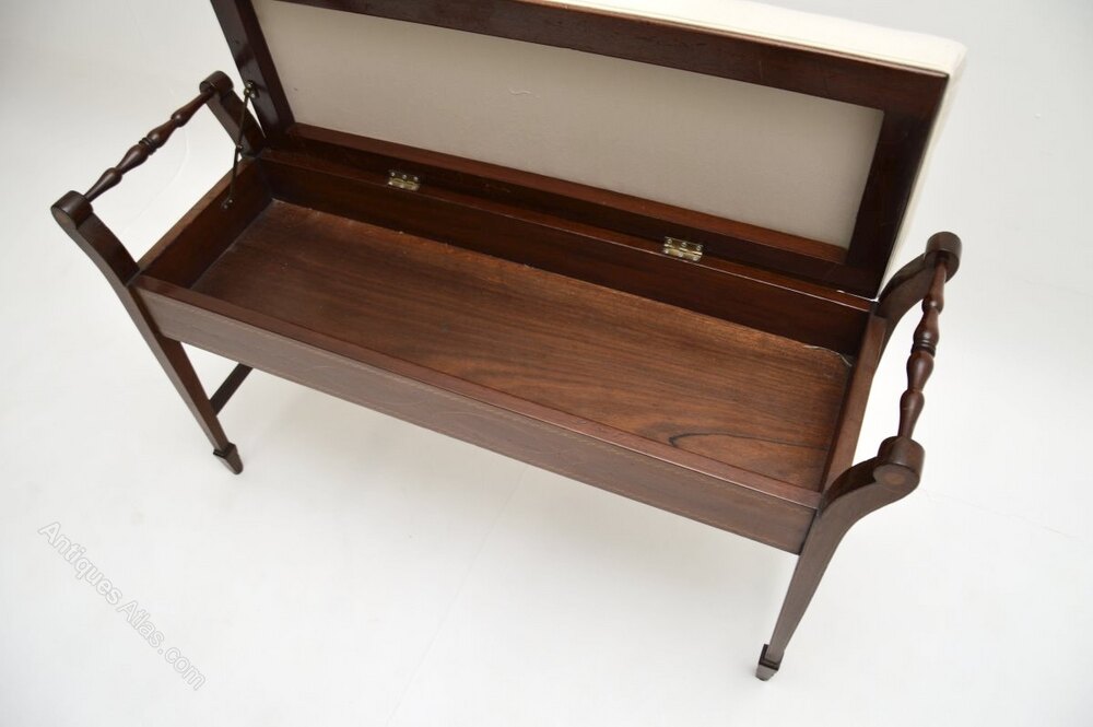 The quality is excellent this has a gorgeous and very useful design. Designed for duets at a piano, this is very useful as a storage bench for an entry way, window seat or even at the foot of a bed. There are beautiful satin wood inlay designs on all sides, the front and back are finished identically, so it can be used as a free standing item. The upholstered seat lifts up to reveal a useful storage compartment, this has spade feet and an H framed stretchered base for extra strength.