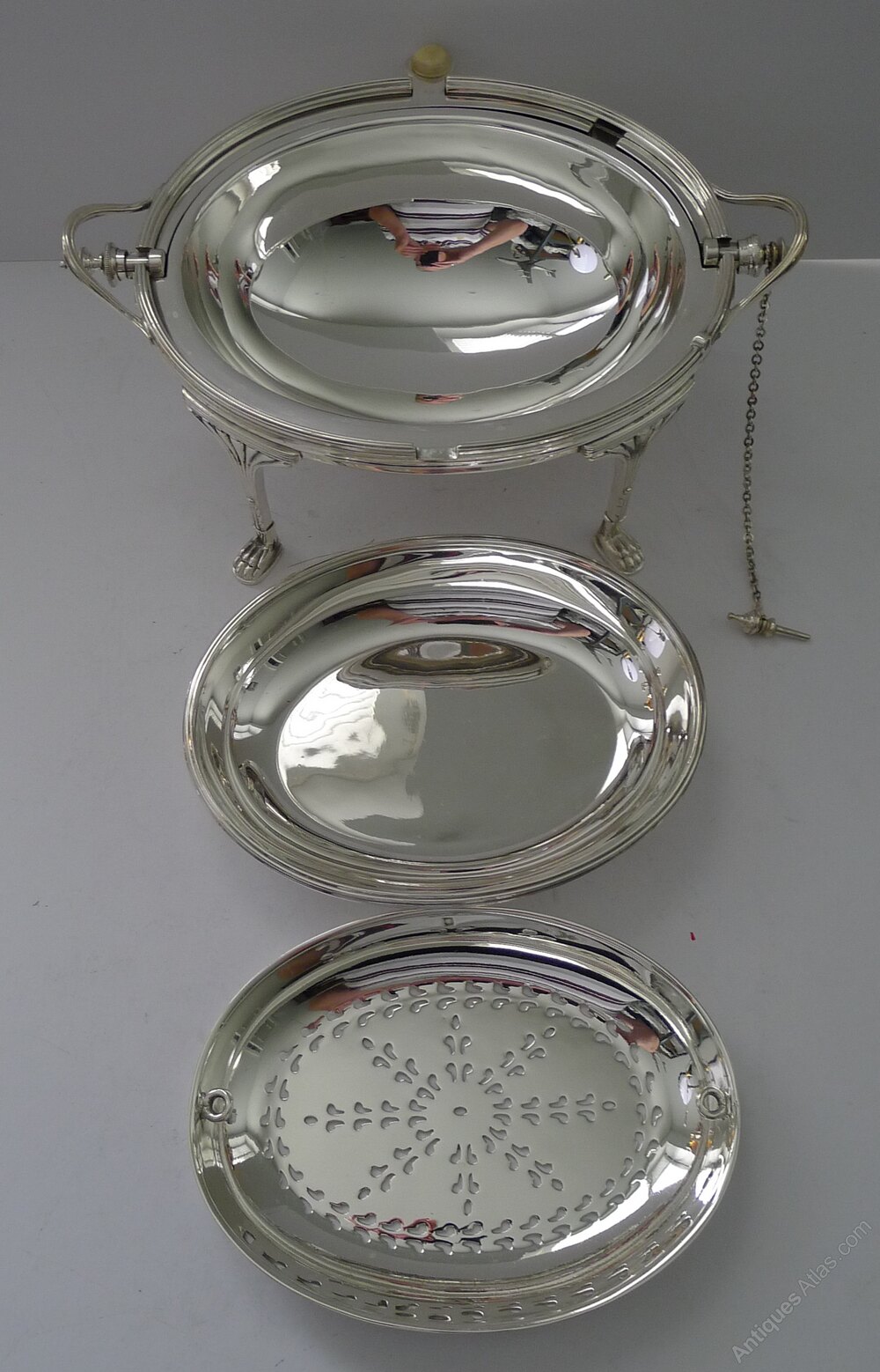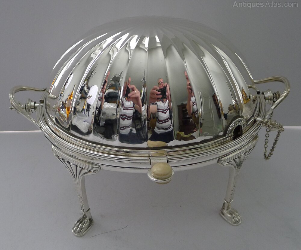 When the knob at the front is pushed back the dome revolves to reveal the two original shallow trays. These are perfect on a buffet to serve either hot (with hot water beneath) or cold (with crushed ice below) dishes a very impressive addition to any occasion.