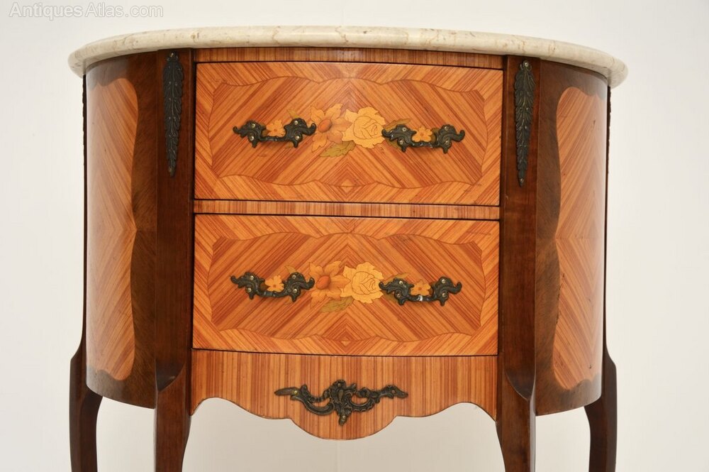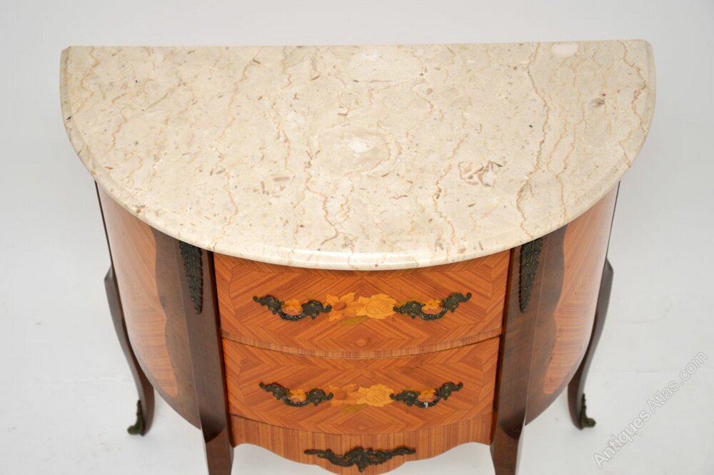 It is of wonderful quality and is a very useful size, perfect for use as a little commode or console table around the home. There are beautiful inlaid designs of various woods, this has a gorgeous cream marble top that sits loose on the base.