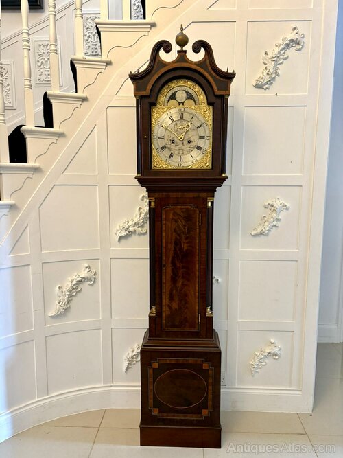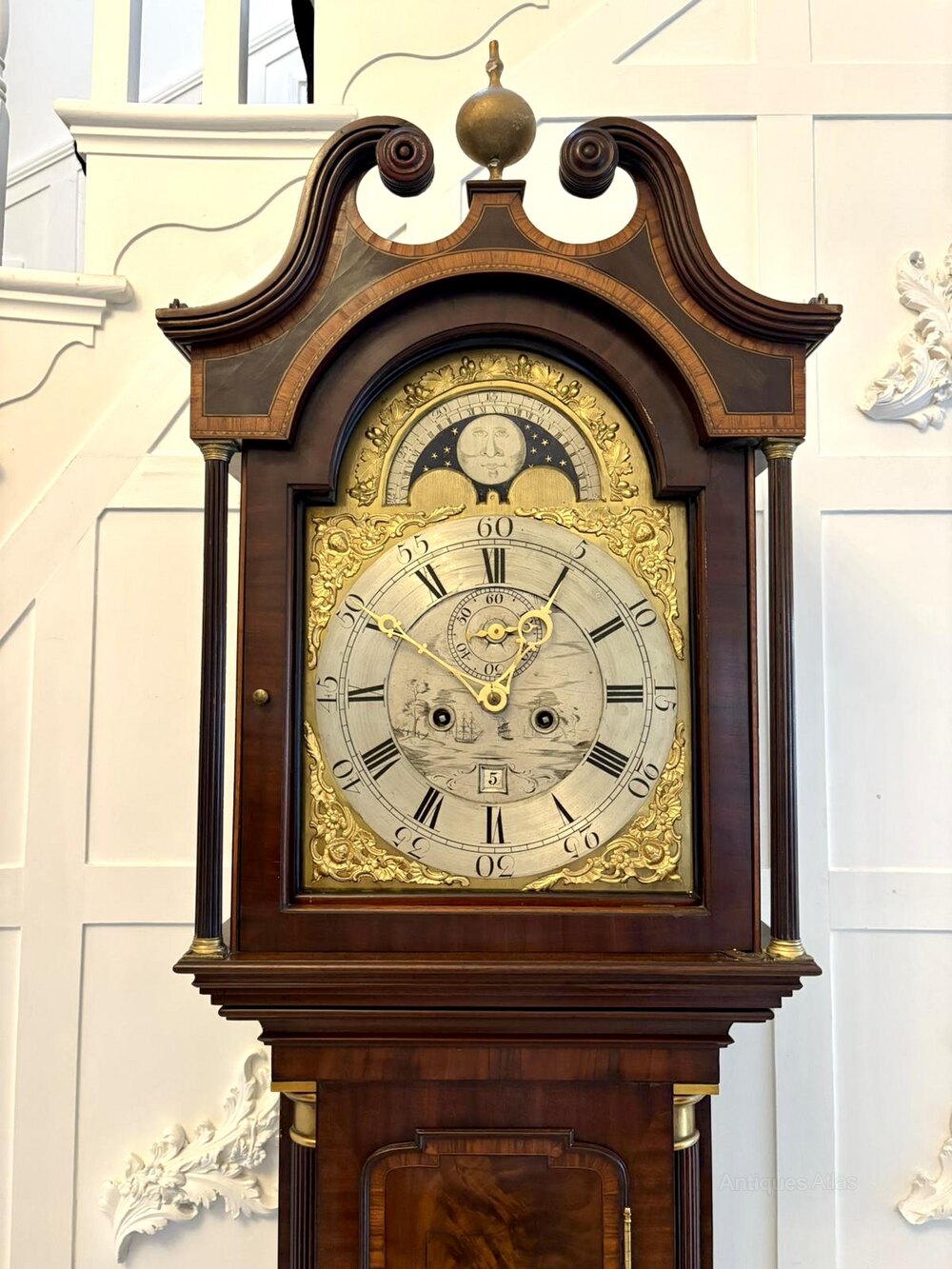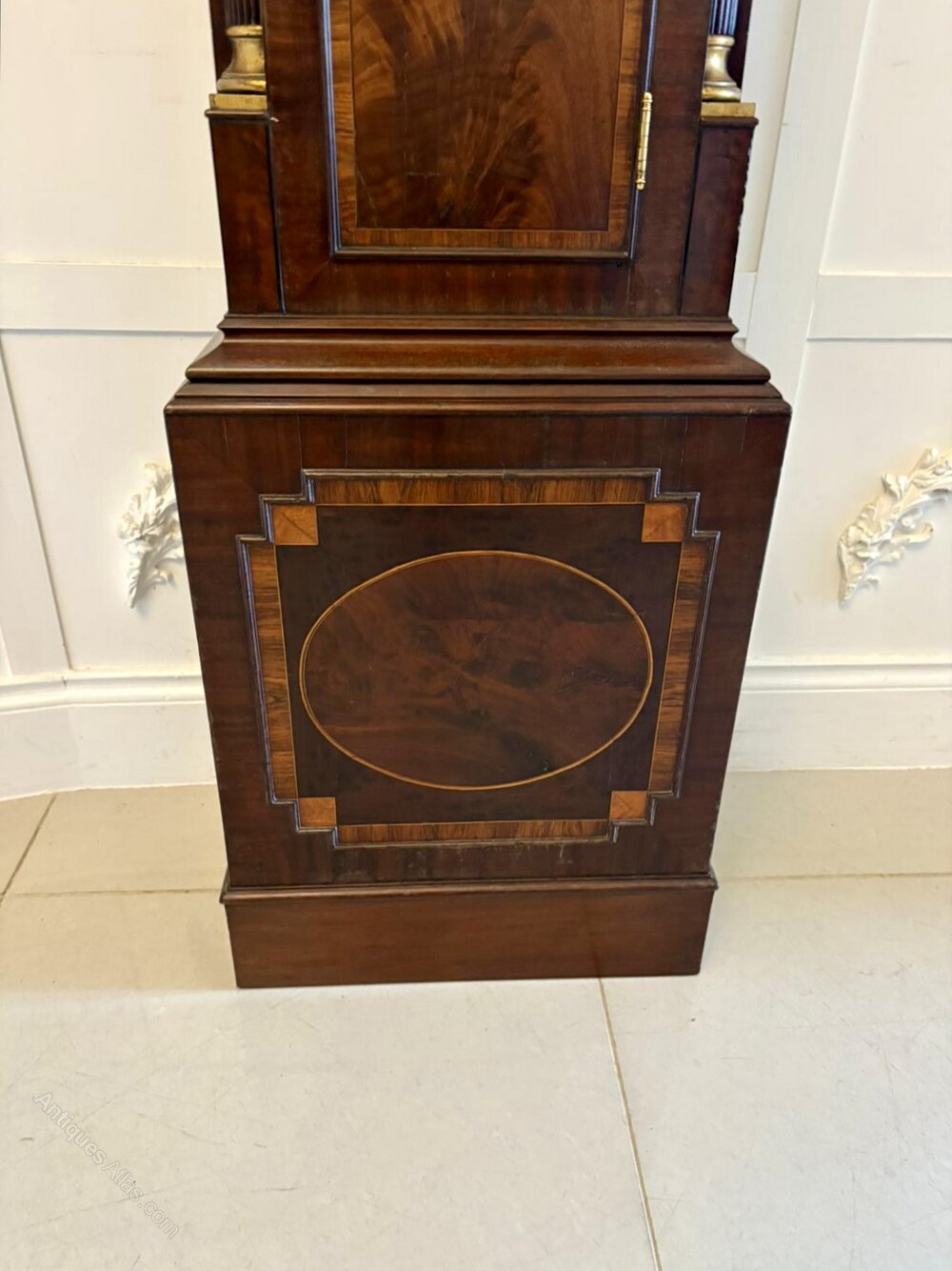 Superb quality antique George III inlaid mahogany brass face long case clock having a superb quality mahogany arch top hood with original brass galleries and finale, figured mahogany door flanked by mahogany reeded columns with gilded brass mounts, inlaid mahogany base, superb brass engraved dial with a moon roller to the arch top, 8 day movement striking on the hour and half hour on a bell, original weights and pendulum.