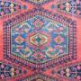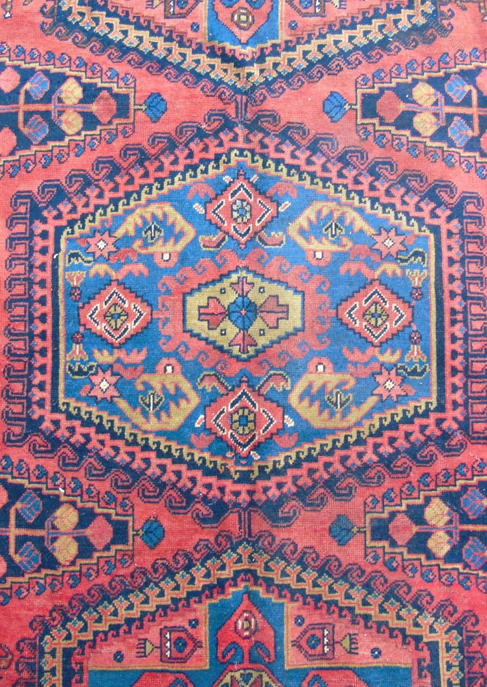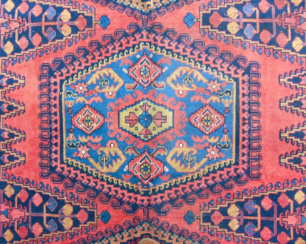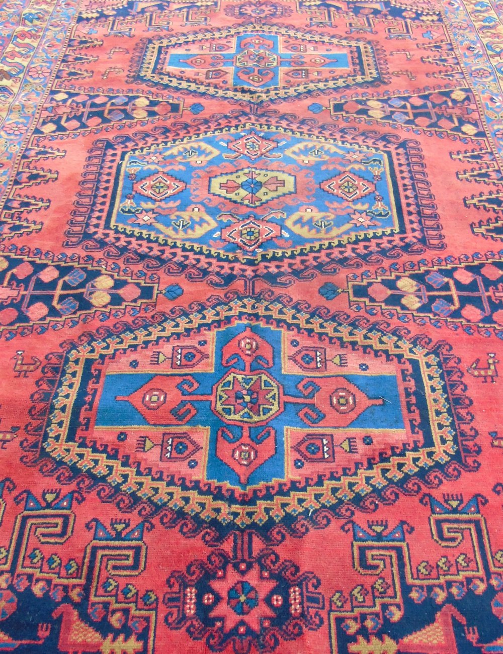This is a beautiful antique Caucasian hand woven Kazak carpet dating from around 1920. The carpet has an eye-catching geometric design with three latched lozenges set within a deep coral pink field. It features many interesting motifs including animals and birds, and features deep indigo, a bright blue and a warm gold shade. This is in excellent condition and has a good even pile. Very pleasing to the eye it is one of those carpets which suits antique or modern setting. A good useful size cleaned and ready for use it measures 322 cms by 204 cms.