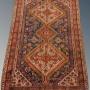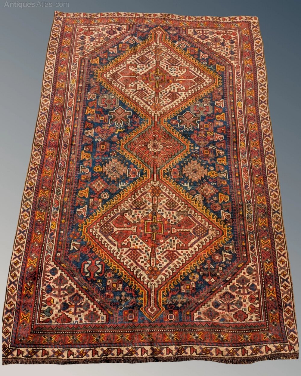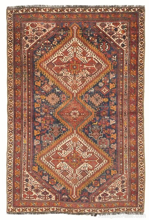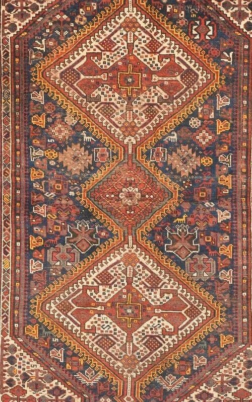 This is a good early 20th century Kamseh carpet in really super condition dating from around 1910. The carpet has a very attractive colour palette with an indigo field of birds, animals and other tribal motifs centred by three hooked medallions and framed by mutliple borders and barber poles. The detail in the weaving is very good for this type of rug and it is a very practical size at 189cm by 125cm