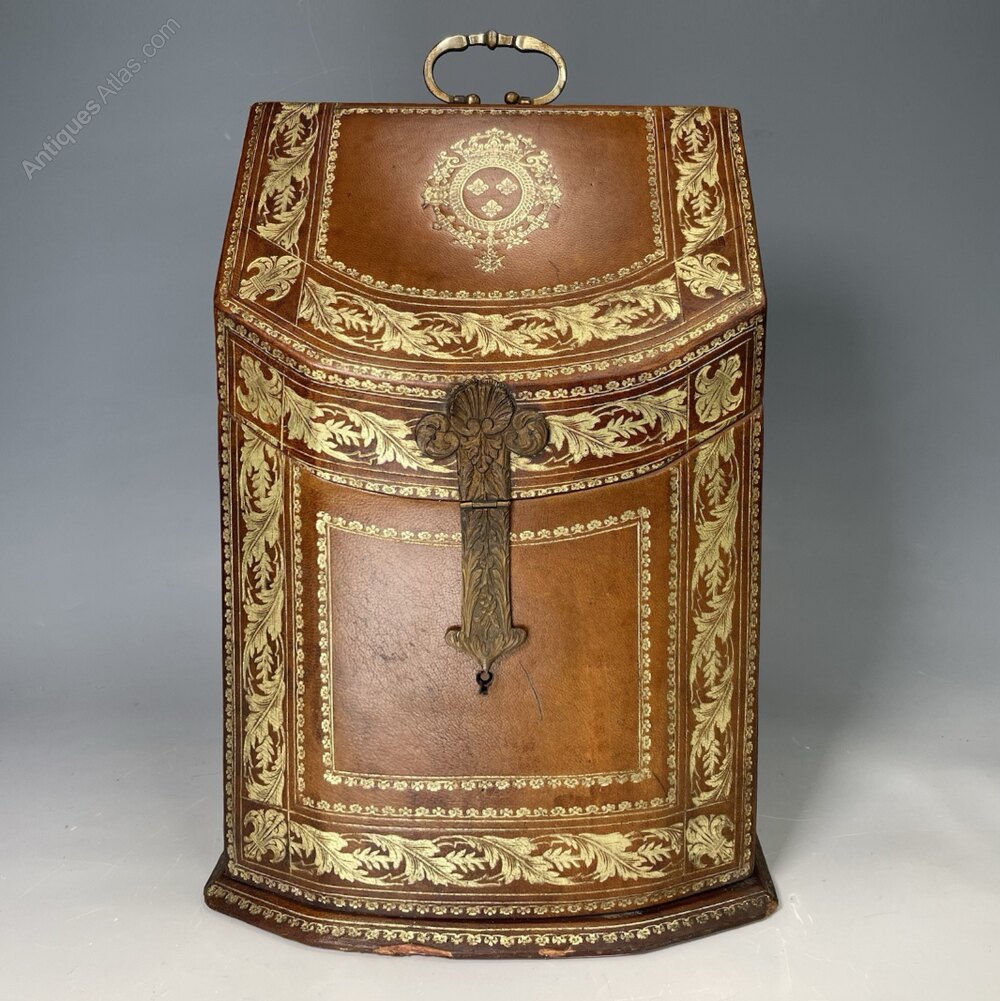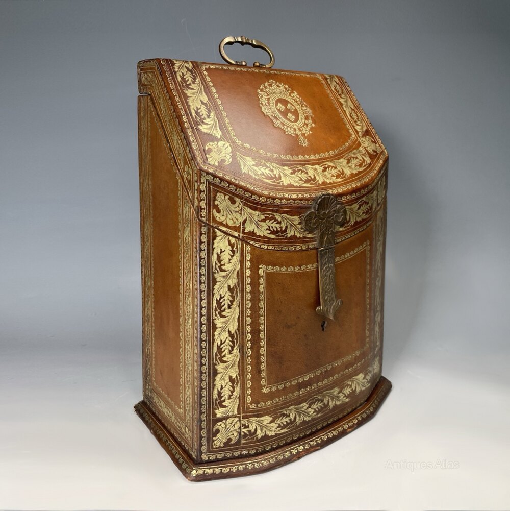 Antique J.C. Vickery Leather Stationery Box with Gilt French Arms on the lid and a red silk Interior, c.1900