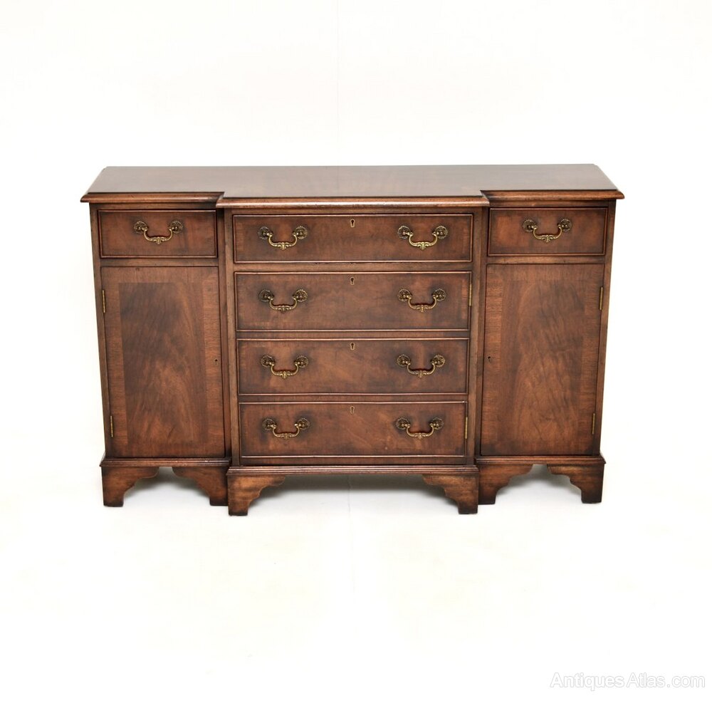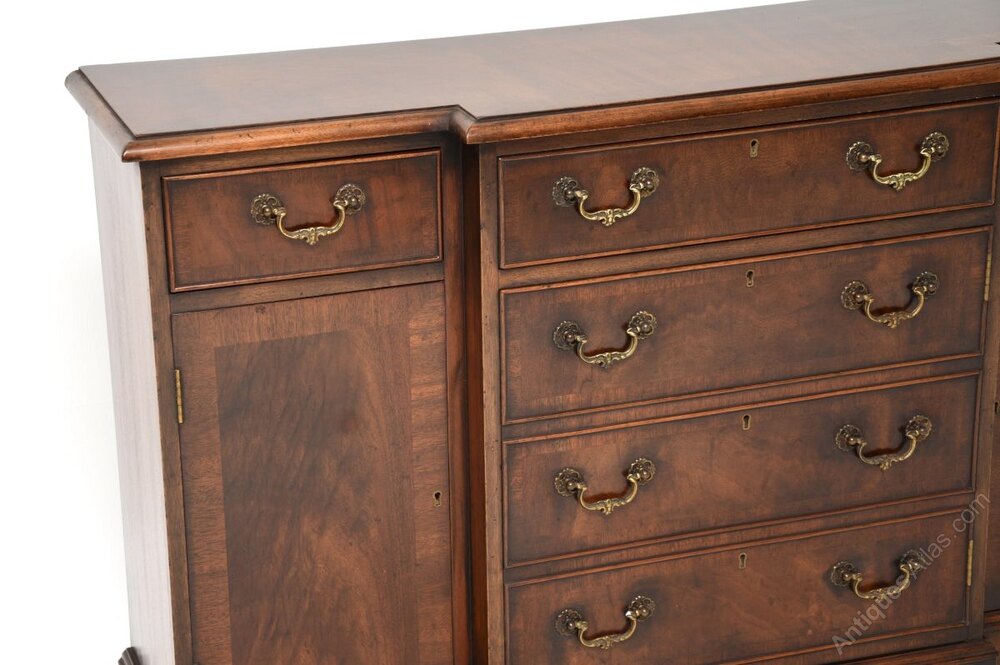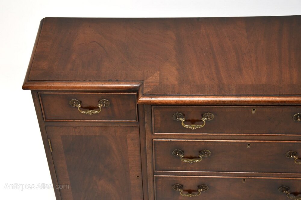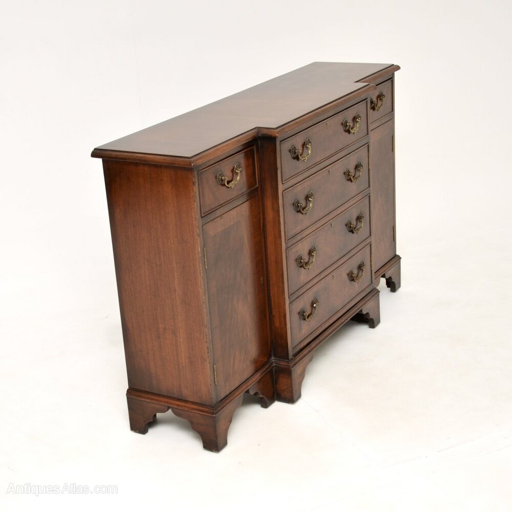 A compact and beautifully made antique Georgian style mahogany small breakfront sideboard. This was made in England, it dates from around the 1950’s period.