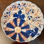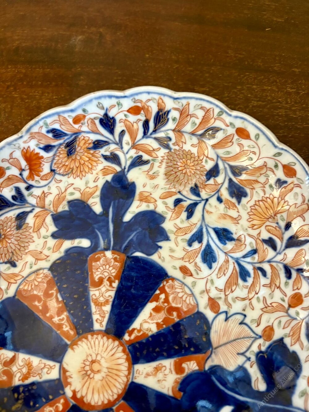 A charming pair of scalloped-edge Japanese Imari plates decorated in the traditional palette of underglaze cobalt blue and overglaze iron-red with gilt highlights. Each plate features a bold central roundel with radiating fan-shaped panels alternating between deep cobalt and intricate foliate motifs. The borders are richly decorated with scrolling chrysanthemum and peony designs, executed with fine detail and exhibiting the expressive brushwork characteristic of early Imari wares.