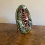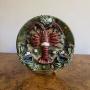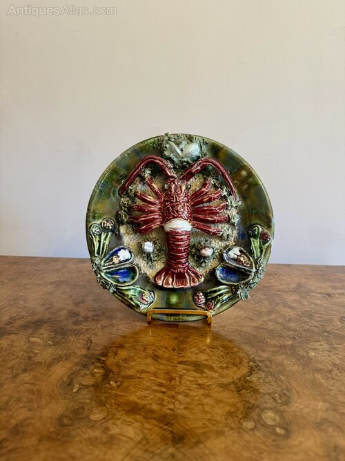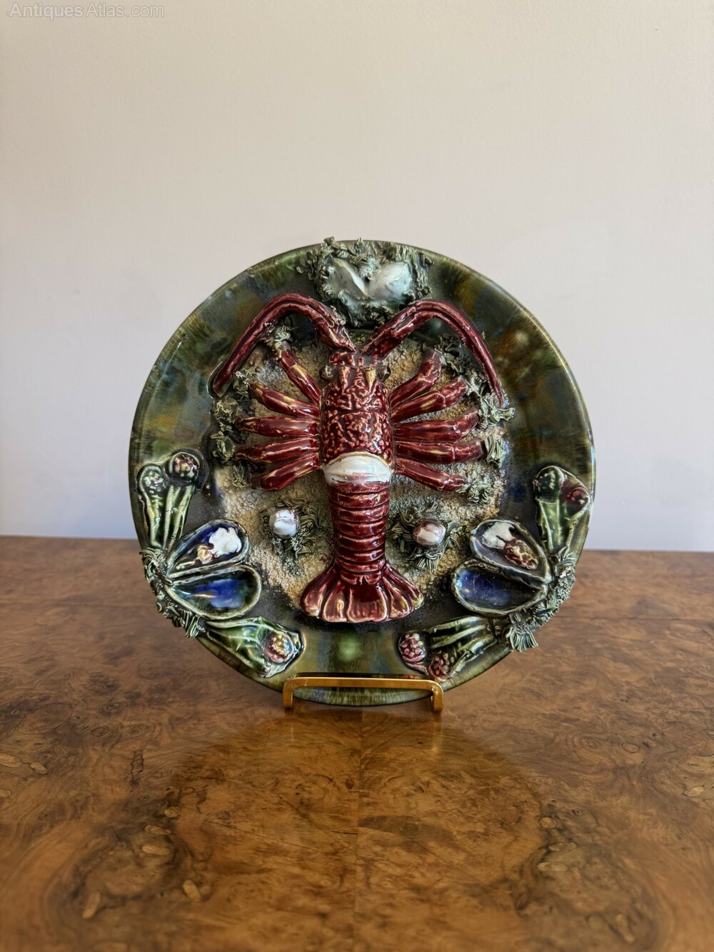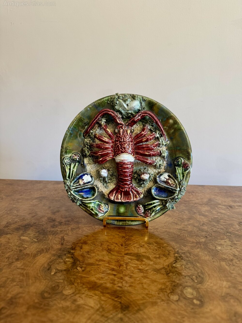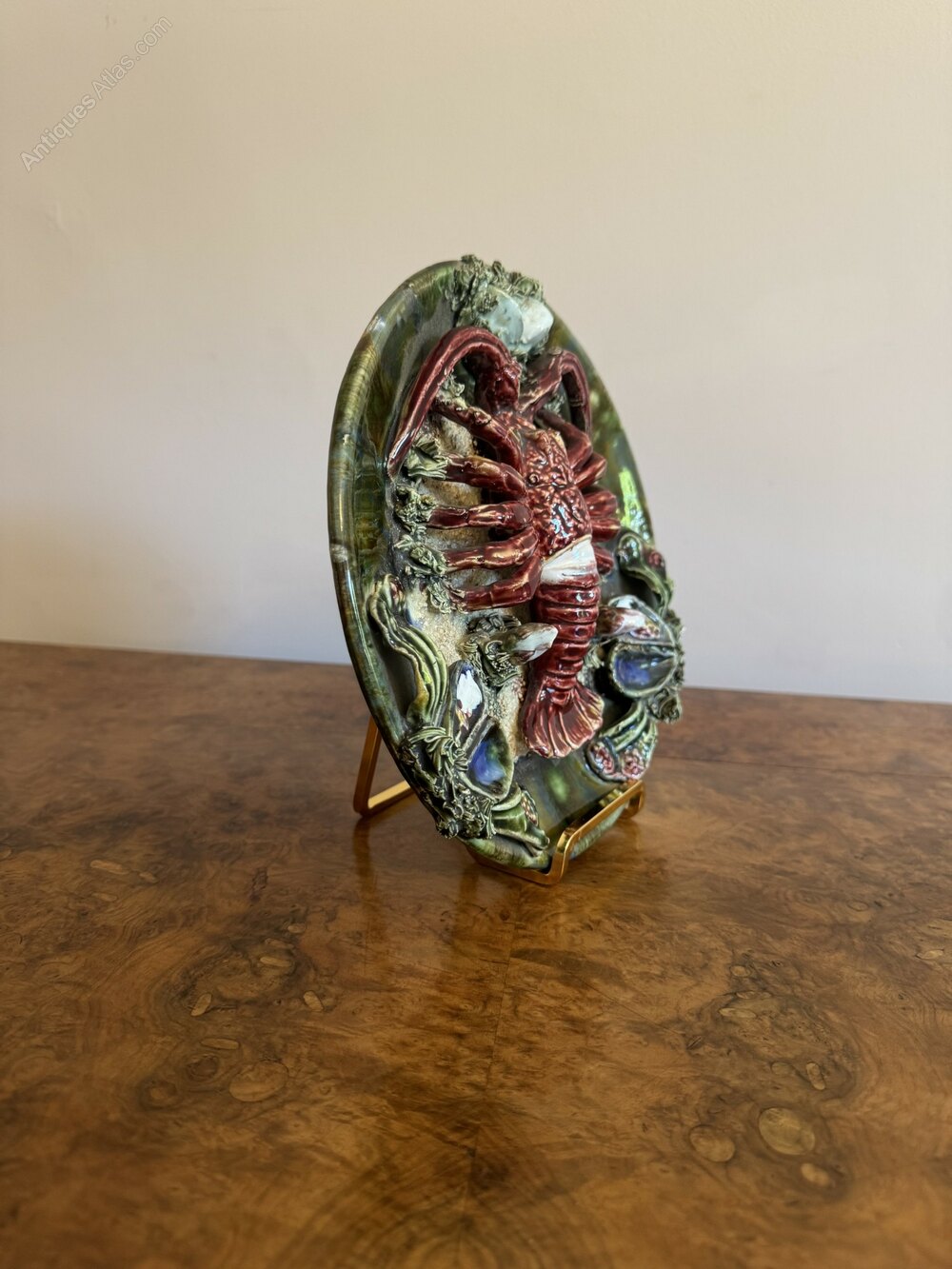 Antique Portuguese majolica palsy ware lobster wall plate featuring a large lobster on a green plate with sand, seaweed and sea shells in a colourfully finished glaze.