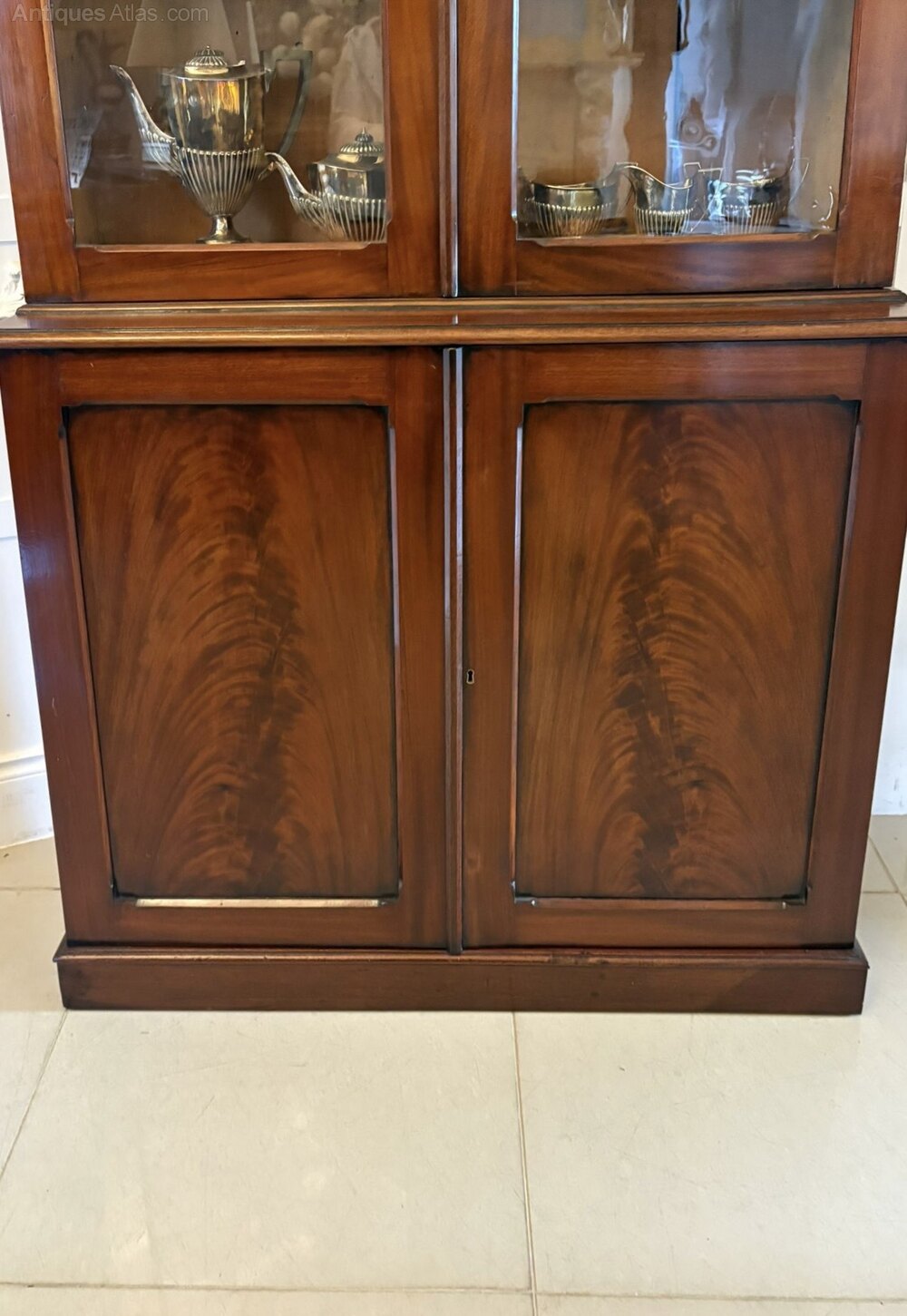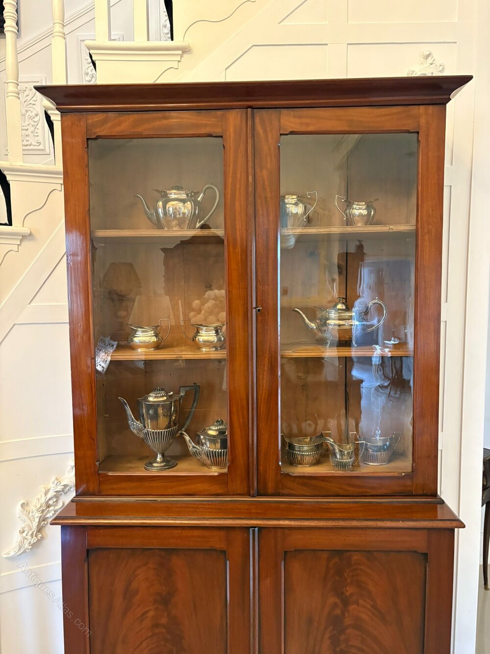 Antique Victorian quality figured mahogany bookcase having a shaped cornice above a pair of mahogany glazed doors opening to reveal three adjustable shelves above a mahogany cupboard with a pair of quality figured mahogany panelled doors opening to reveal a shelf storage interior standing on a plinth base.
