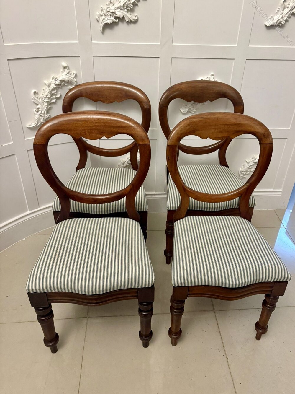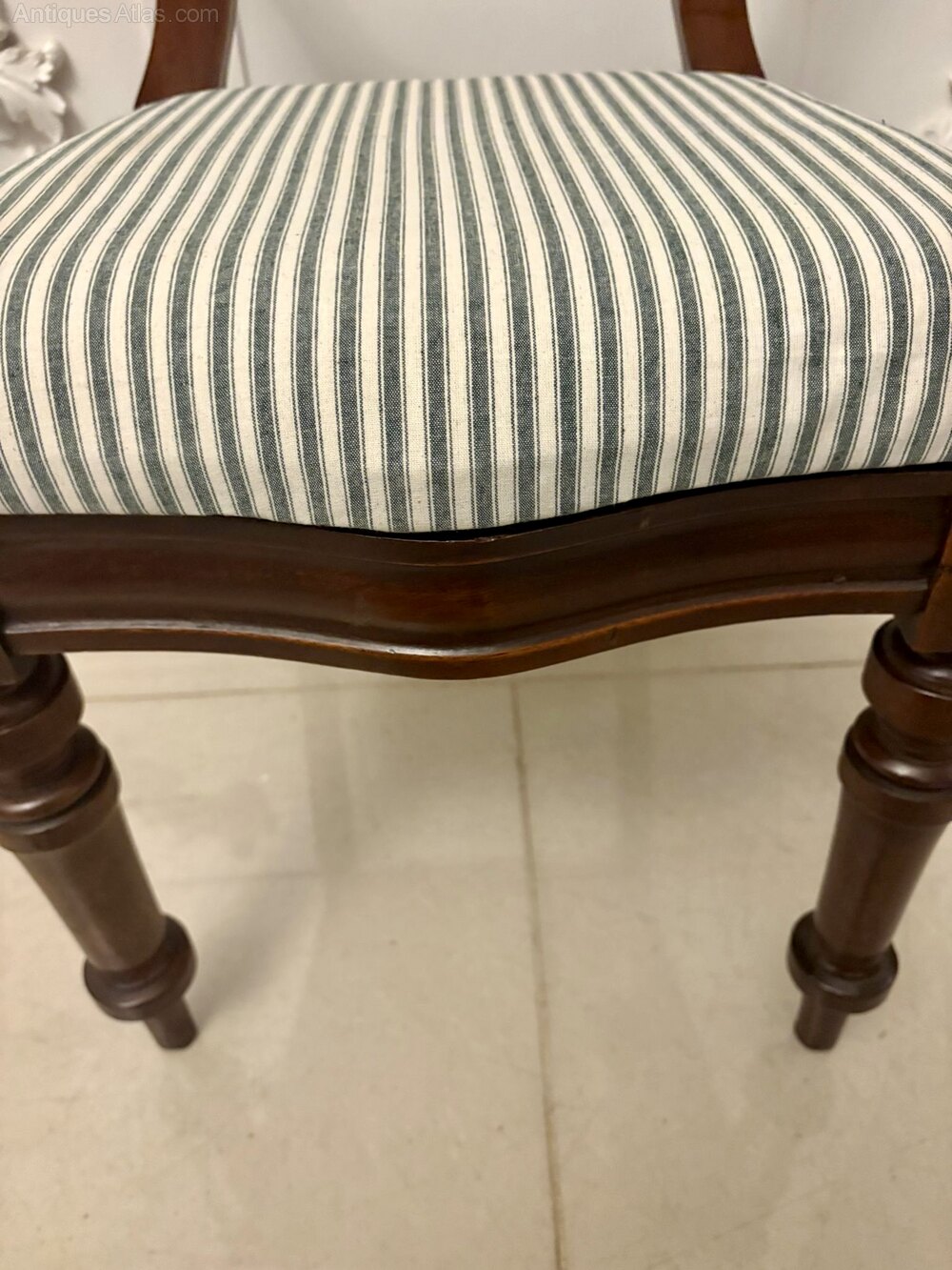 The seats have been newly upholstered in a smart striped fabric that complements the rich tone of the mahogany, offering a fresh and clean finish while remaining sympathetic to the period style. The chairs stand on turned front legs and swept rear supports, providing excellent stability and a classic Victorian profile. Comfortable, sturdy and well proportioned, they work beautifully around a dining table or as occasional seating in any room.