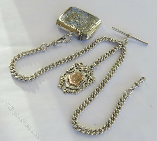 Antique Silver Double Pocket Watch Chain And Vesta