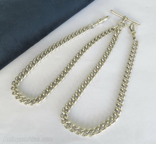 The chain has various silver hallmarks but they are difficult to read. Each chain measures 30cm long including the T-bar and the clasp, or 56cm long clasp to clasp.