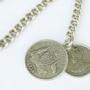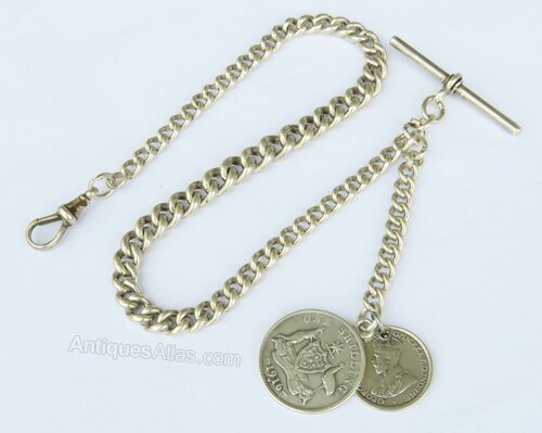 The chain comes with two fobs formed from coins, an Australian George V 1920 sixpence and an Australian George V 1916 one shilling.