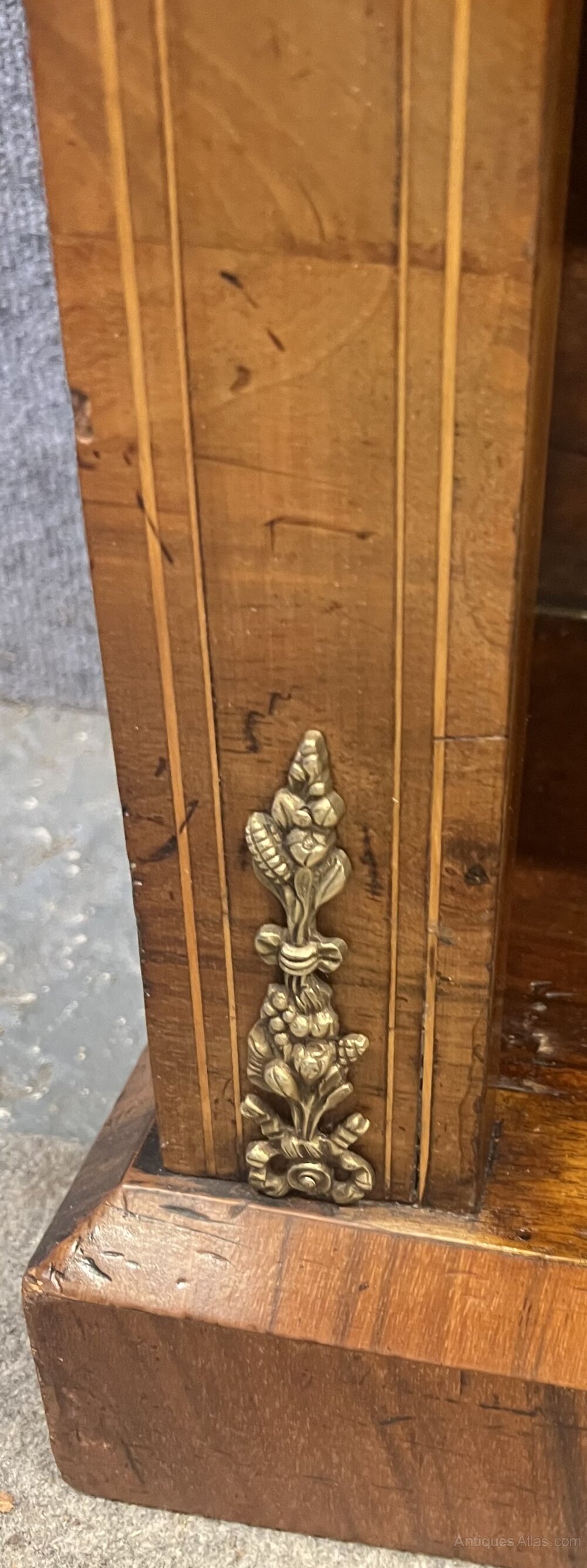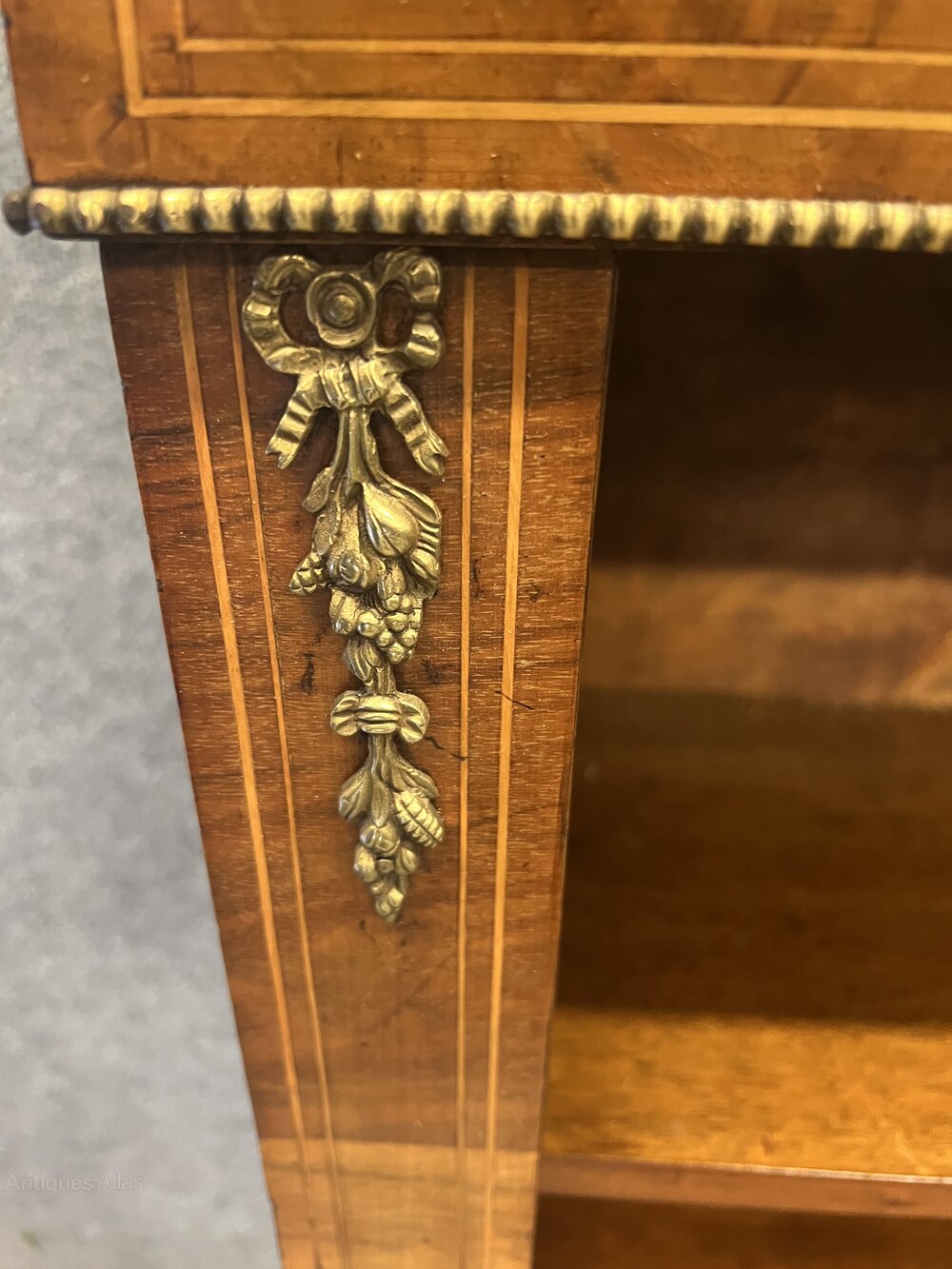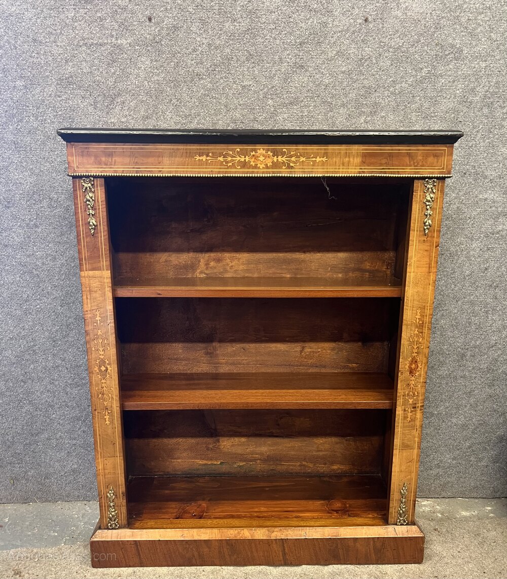 A late Victorian walnut and inlaid open bookcase, the rectangular shaped top having an ebonised moulded edge above the marquetry inlaid frieze. The stiles having good cast brass mounts with conforming marquetry inlay and boxwood stringing. The interior having 2 polished shelves and the whole raised on a chamfered edge and cross banded plinth base.Condition- Very good. Dimensions:- Height…39’’/ 99cm.Width…31.25’’/ 79.5cm. Depth…11.5’’/ 29cm. Interior Shelf Depth…8.5’’/ 21.5cm. Delivery to most of U.K. mainland £55.