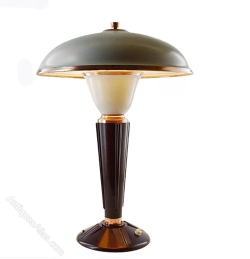 Designed by Eileen Gray for the French Jumo company and dating to the 1930s-1940s this very stylish lamp is made from two primary components which are bakelite and metal. Superb mushroom shape enameled metal shade with copper accents and finial. Condition is excellent with minimal signs of age. Highly collectible, we are lucky enough to have two of these should you want a pair please inquire. Ideal for desks, center antique tables etc, beautiful ambient lighting. UK delivery £15, insured via UPS.