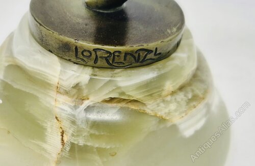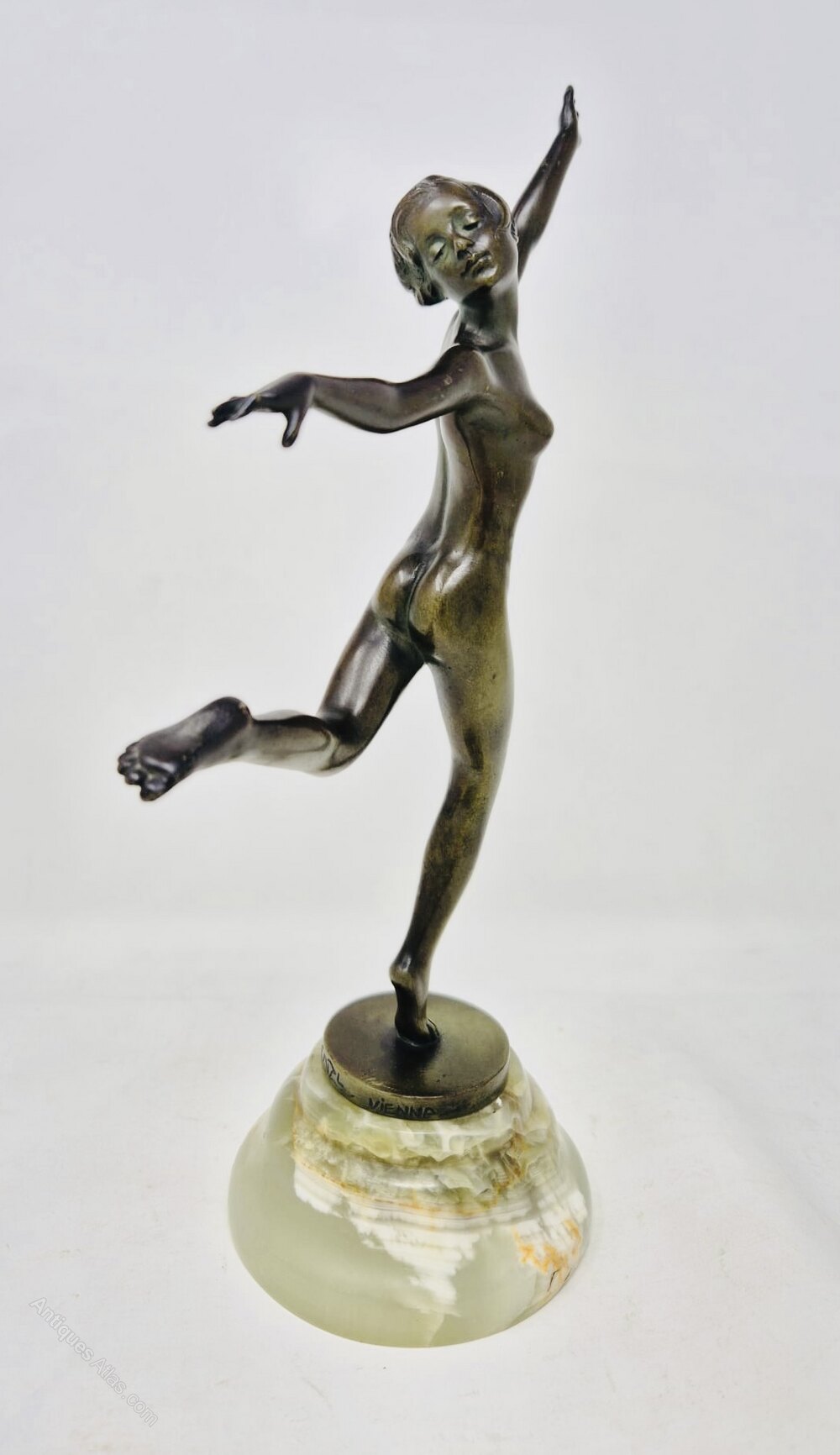 A fine greenish bronze Art Deco bronze by Joseph Lorenzl on a green onyx base. The condition is good with no damage or restorations. The height is 30 cm.
