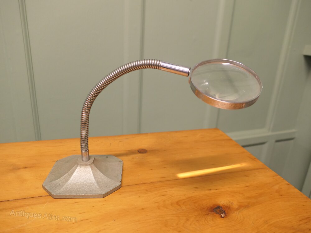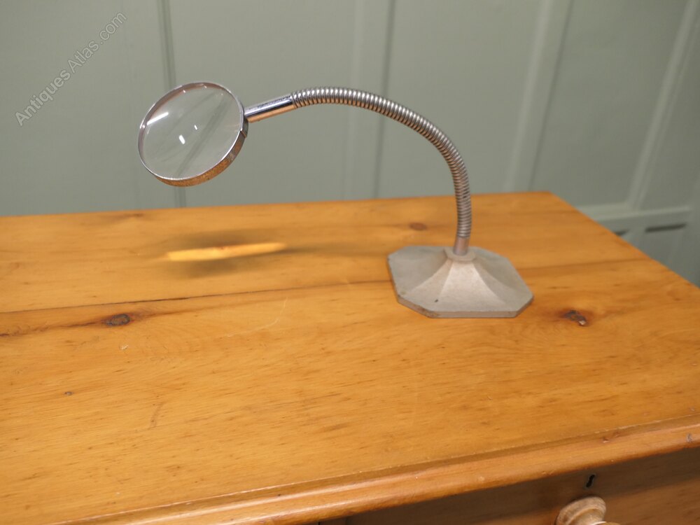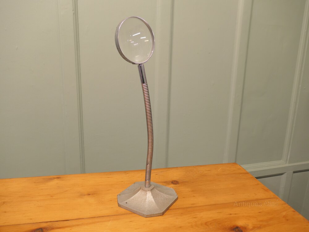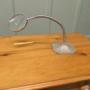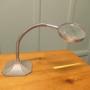 Art deco, swan neck, bendy desk desktop magnifier in a silver metal finish with weighted 6” base