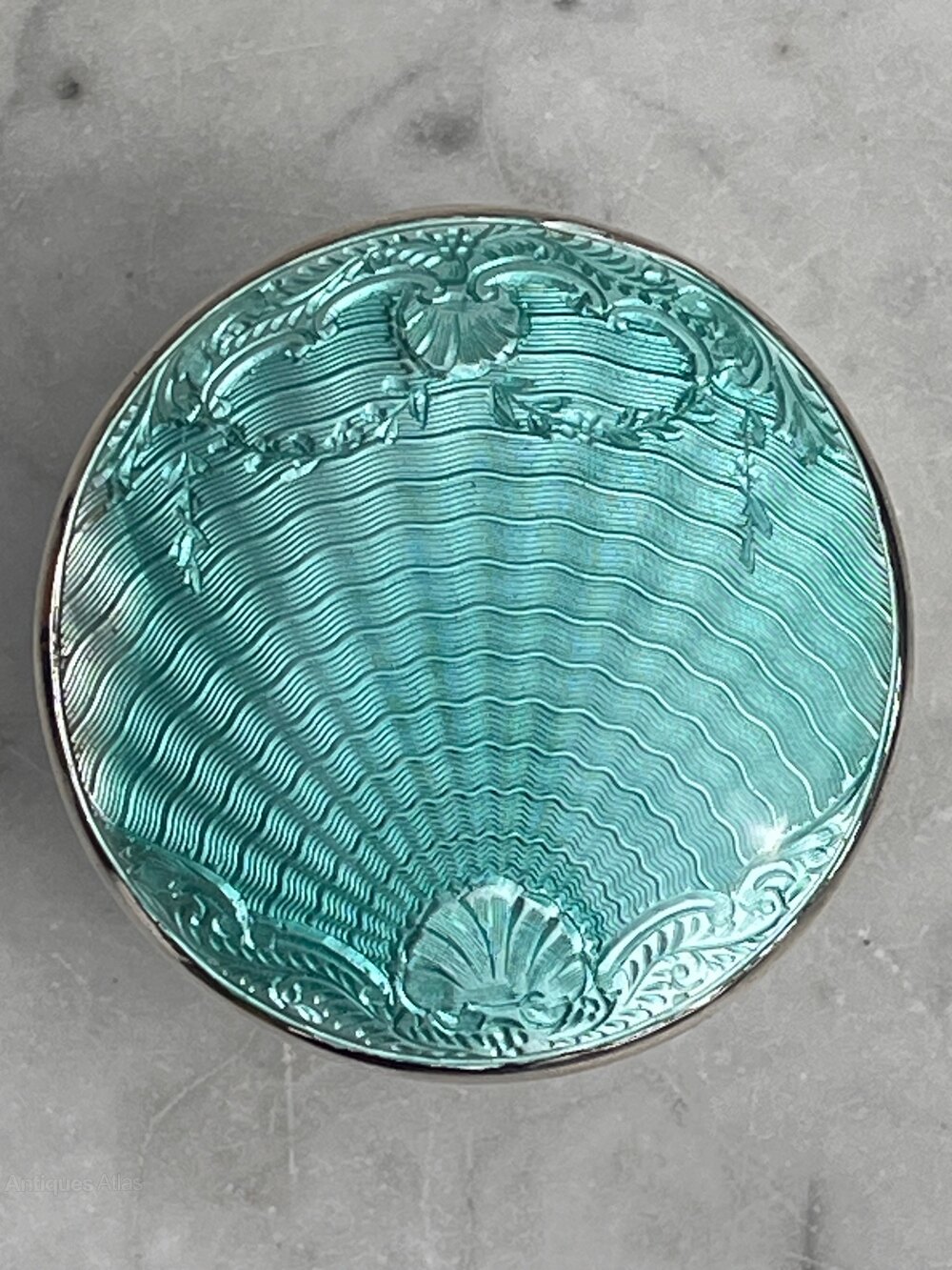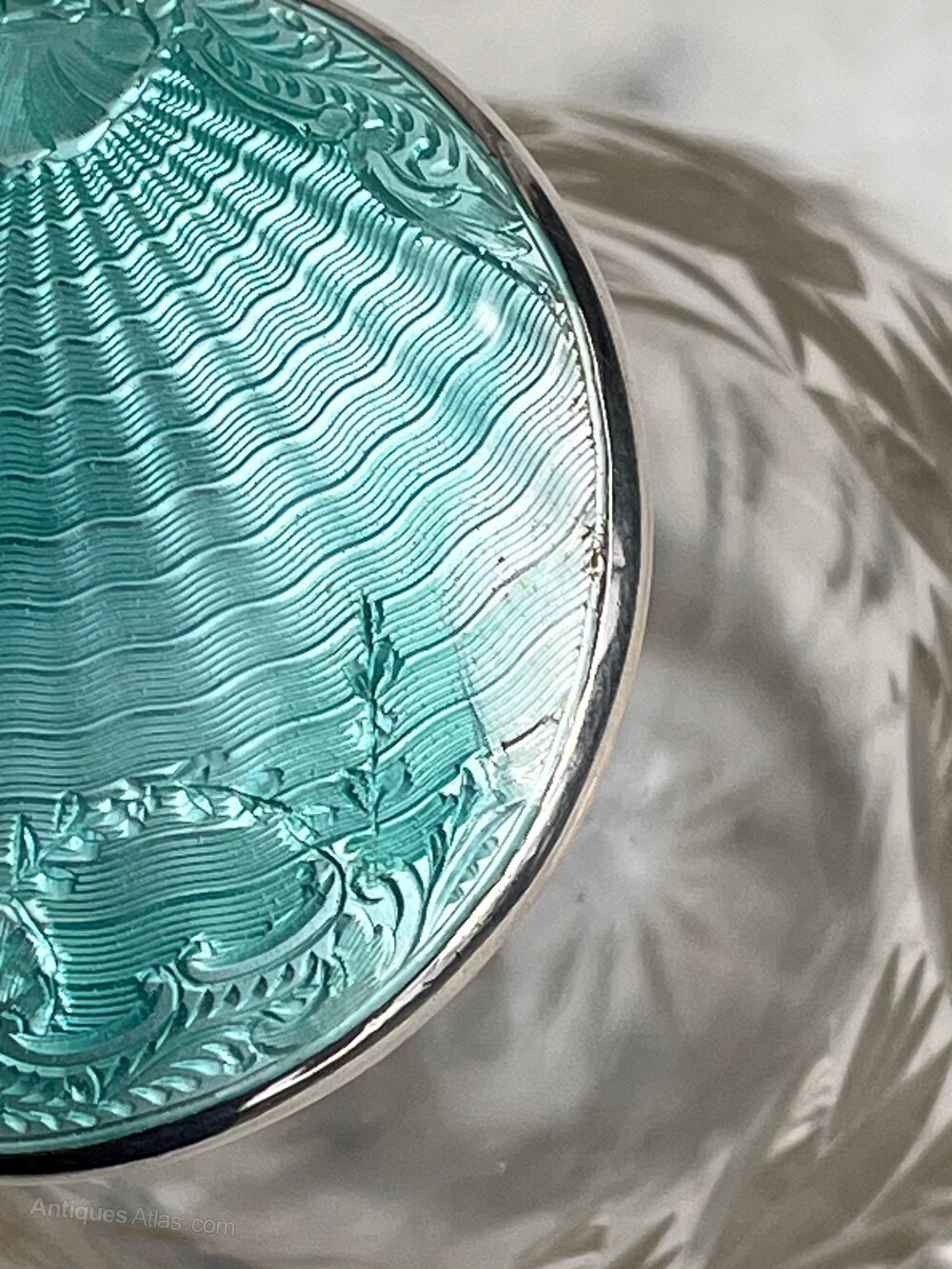 Hallmarked Birmingham 1929, a very pretty cut glass dressing table perfume bottle with a silver and turquoise guilloche enamel shell and sunburst top. The baluster shaped bottle is crisply cut with a fluted and leaf design and retains its original glass stopper.