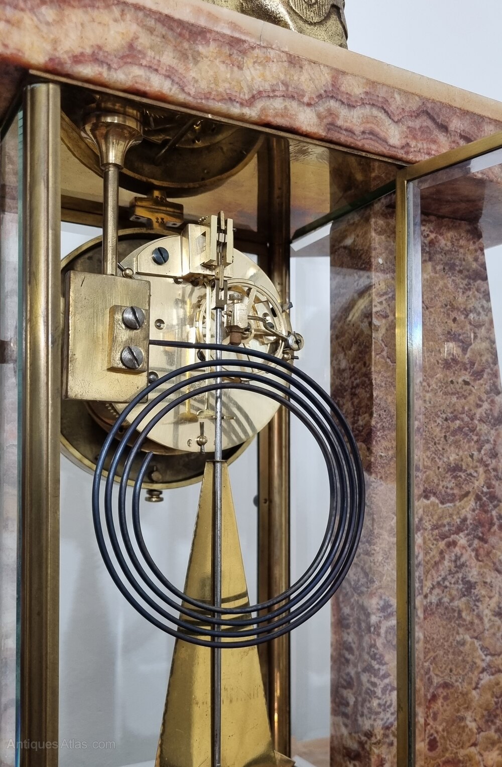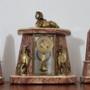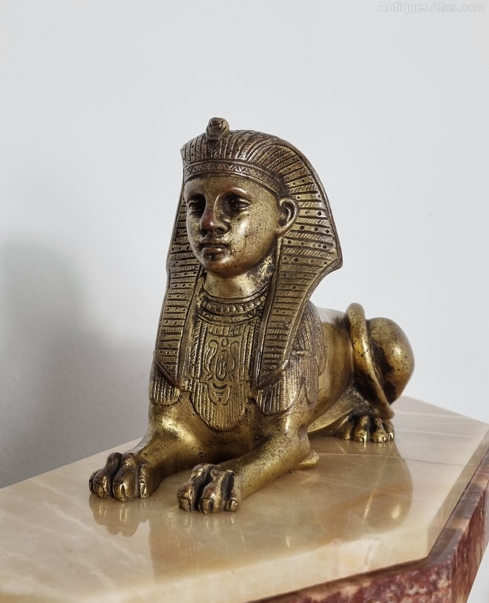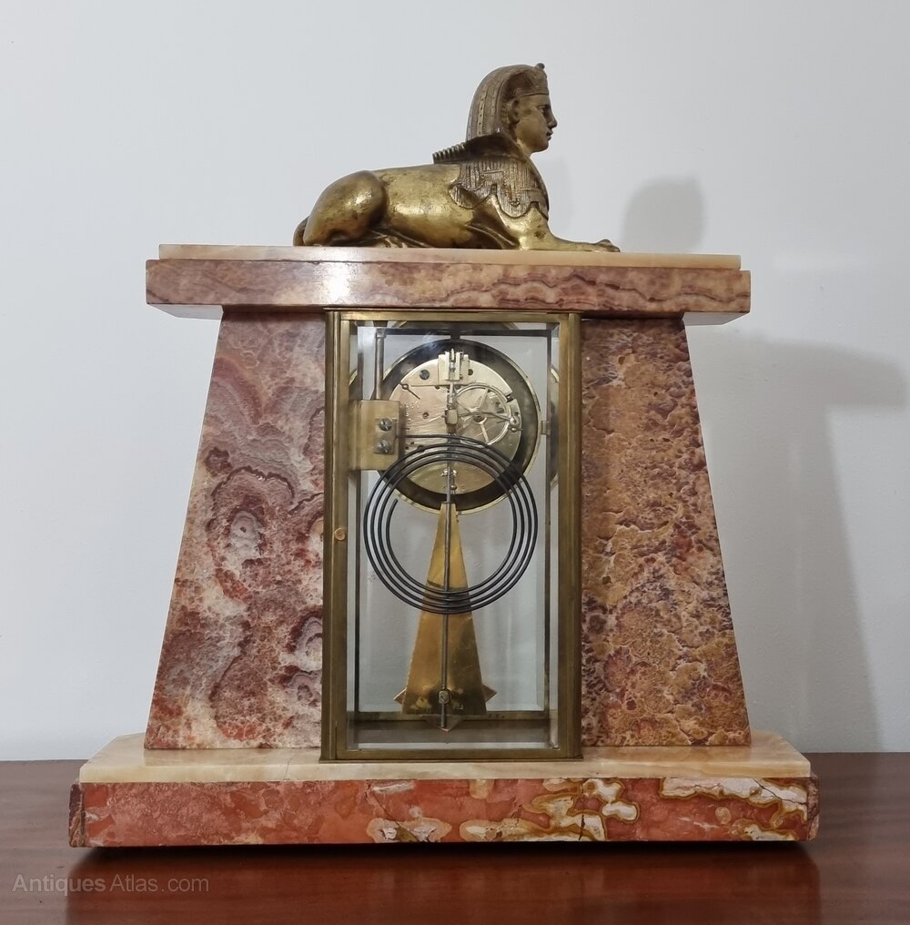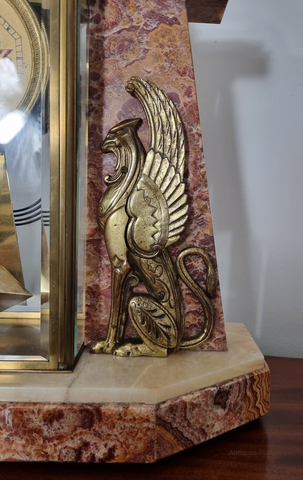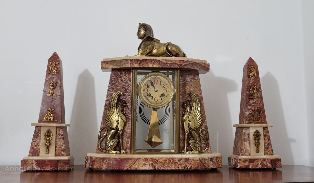 A stylish Art Deco Egyptian Revival clock set featuring a central timepiece flanked by a pair of obelisks, this piece exudes the grandeur and mystique of the early 20th-century fascination with ancient Egypt. Atop the clock sits a regal sphinx cast in gilt bronze, while two magnificent gilt bronze griffins are positioned on either side of the glass-panelled case, showcasing exceptional craftsmanship and attention to detail. The obelisks are beautifully carved from richly veined marble and white onyx, adorned with Egyptian motifs, evoking the splendour of the civilisation that inspired this design. Hieroglyphic-style reliefs further enhance their decorative appeal . In good, original condition with expected signs of age and use including old repairs to the case. The clock’s movement has recently been professionally serviced, ensuring it is in good, working order. Highly unusual and extremely rare, this clock set would have been commissioned as a bespoke item rather than mass-produced, making it a true collector’s piece. A remarkable opportunity for any Art Deco enthusiast. Clock: 42 cm L x 48 cm H x 15 cm D Obelisks: 38 cm H x 14 cm L x 13 cm D