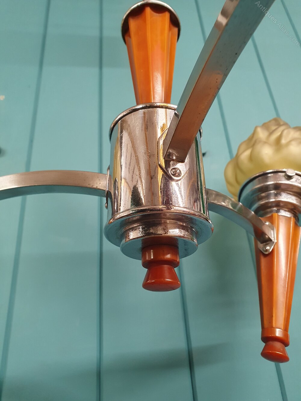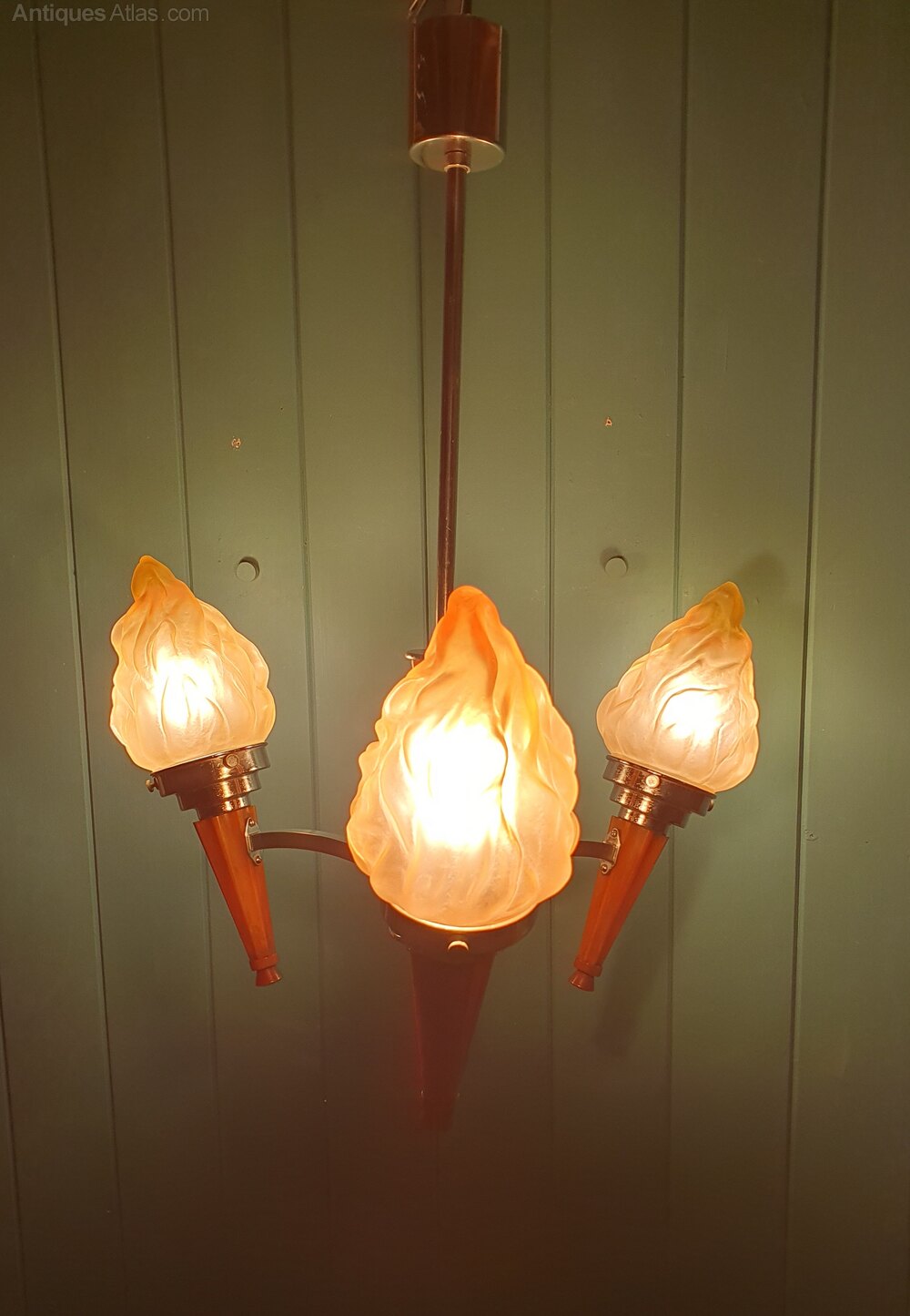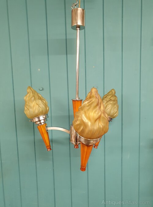 This Art Deco Empire torch chandelier is in chrome and Bakelite, with three opaque New York flames. The chandelier has been restored there has been some pitting to the chrome in places (please see pictures). This is not visible once the chandelier is hung. The measurement of the width, from the tip of one New York flame to the other, is 45 cm. The length of the centre pole could be shortened to fit your space if needed. This piece comes with large bayonet bulb holders B22.