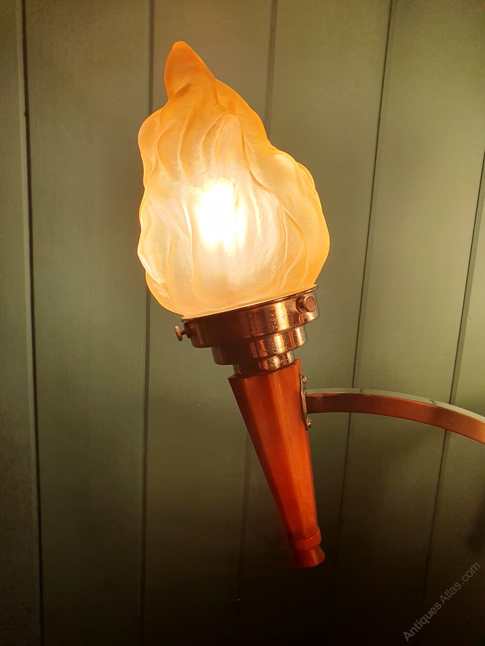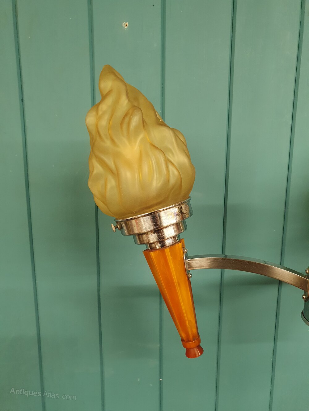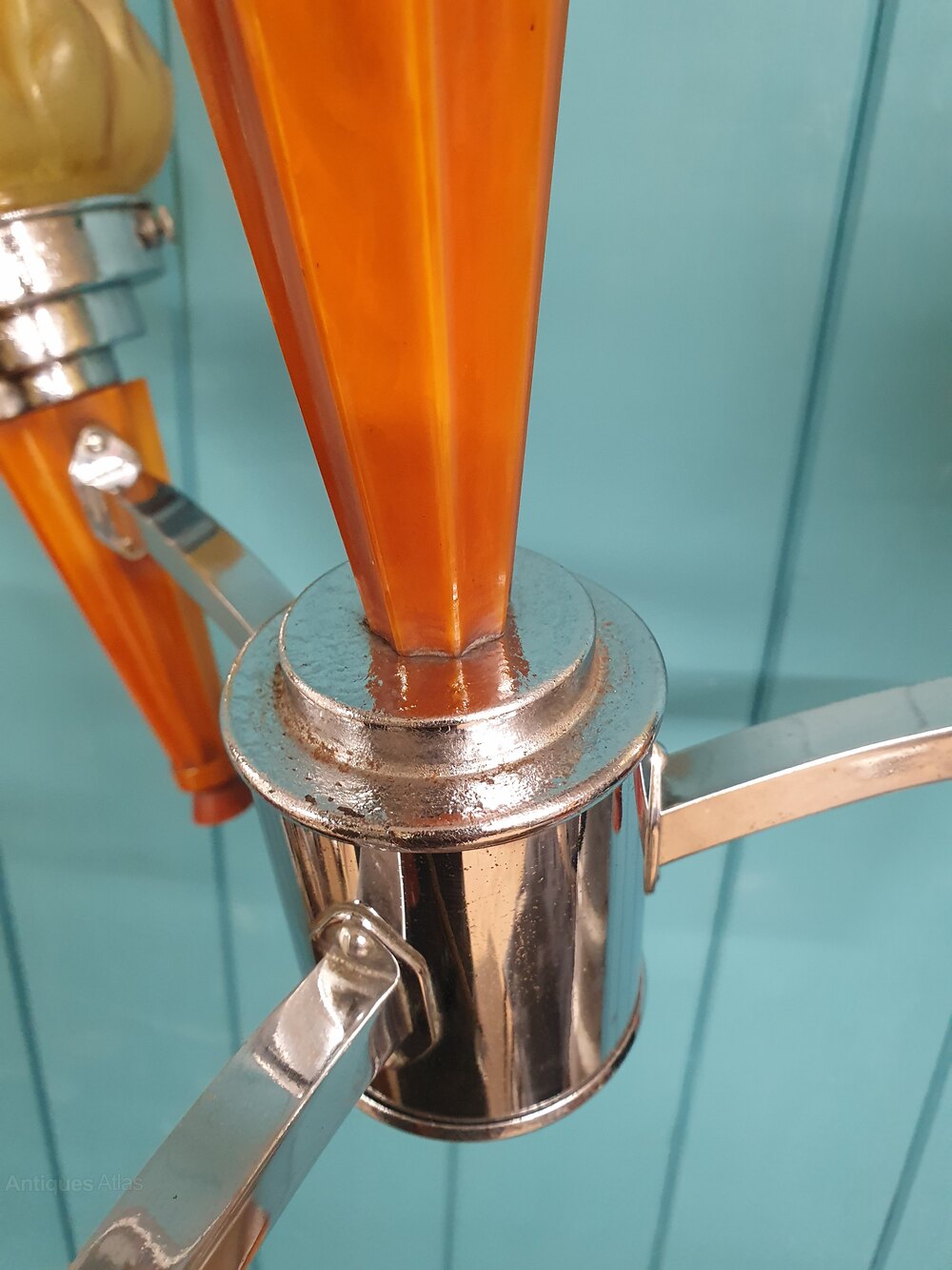 This Art Deco Empire torch chandelier is in chrome and Bakelite, with three opaque New York flames. The chandelier has been restored there has been some pitting to the chrome in places (please see pictures). This is not visible once the chandelier is hung. The measurement of the width, from the tip of one New York flame to the other, is 45 cm. The length of the centre pole could be shortened to fit your space if needed. This piece comes with large bayonet bulb holders B22.