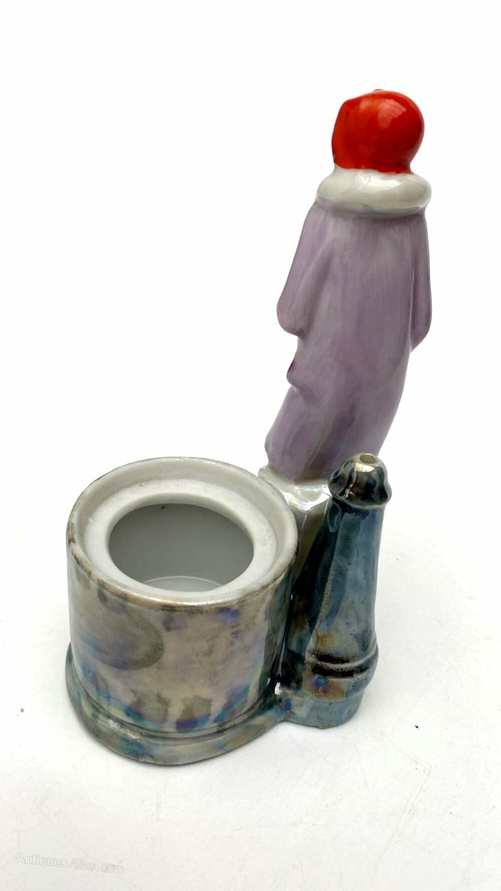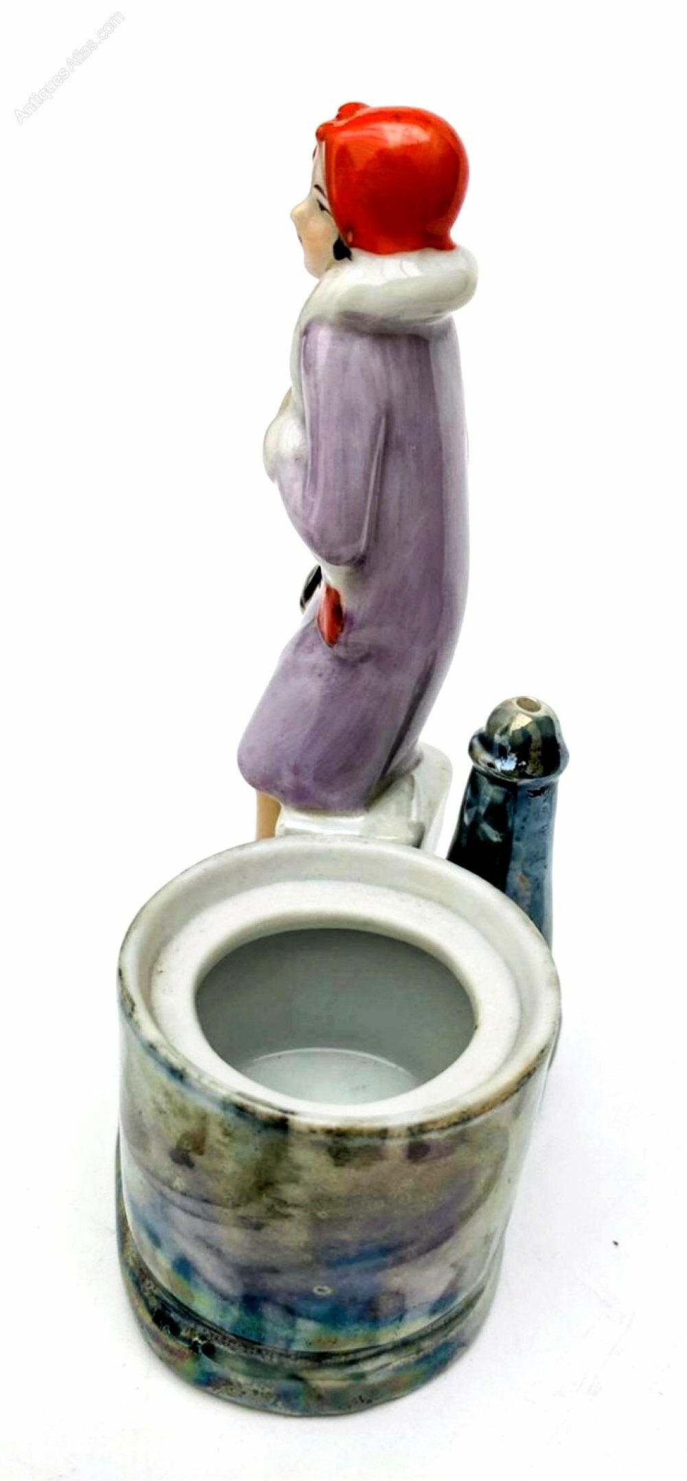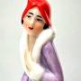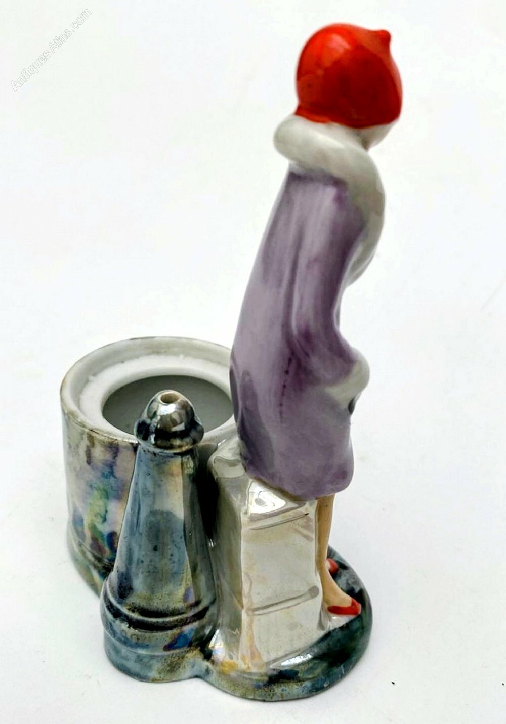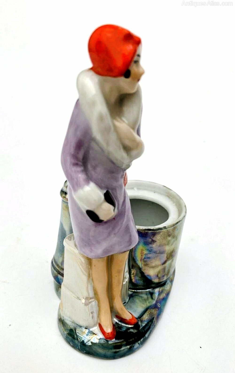 your consideration is this very attractive and totally original Art Deco glazed porcelain flapper girl figurine dating to around 1935. She's an impressive height standing 12 cm overall. This wonderful figure is in the form of a flapper girl dressed in the fashion of the day in a pretty fur lined lilac wrap coat and cloche hat and very enchanting porcelain powder / trinket box, dating to the 1930's , sourced in France. The attention to detail is just wonderful, so skillfully painted, from her slightly blushed cheeks to her creased coat, everything about this piece screams quality and at every angle she looks amazing. Behind the figure is a lidded pot which can be used for powder of trinkets.