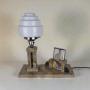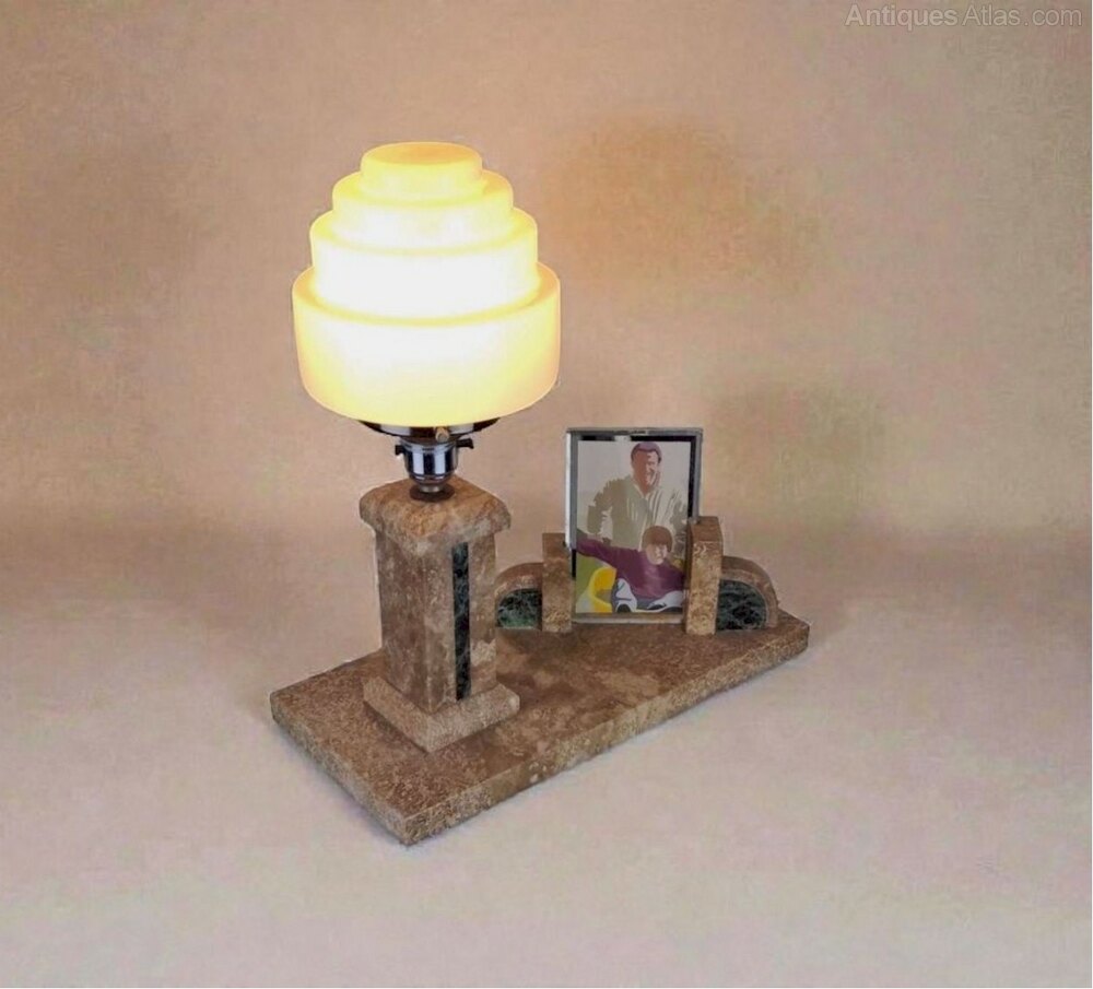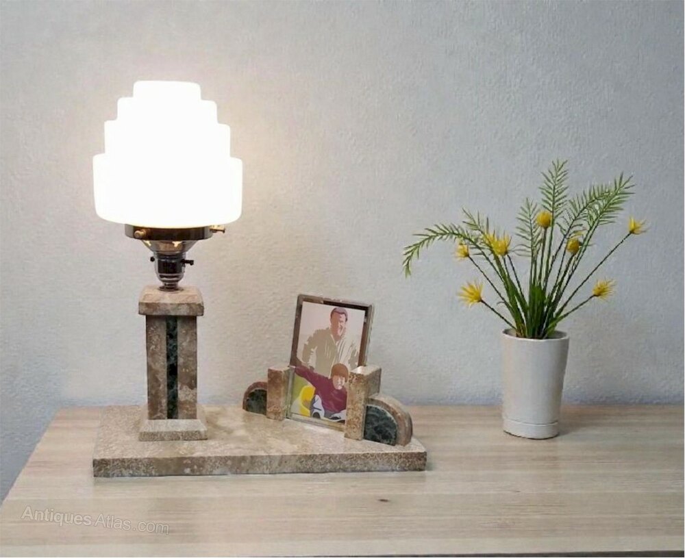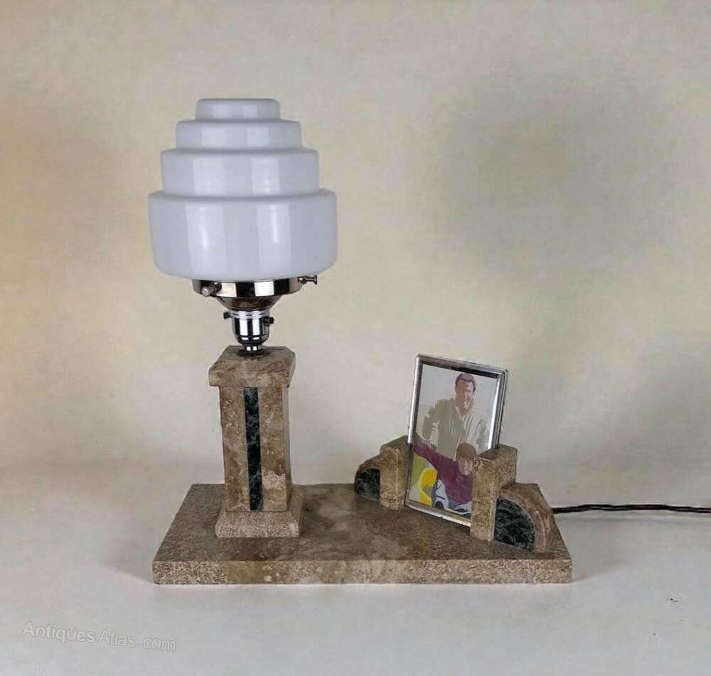 Stylish art deco table lamp in 2 tone marble which incorporates a matching , asymetric , mirror edged , picture frame and geometric stepped milk glass shade . This has been rewired with silk cord , PAT tested with certificate and is ready to plug in.