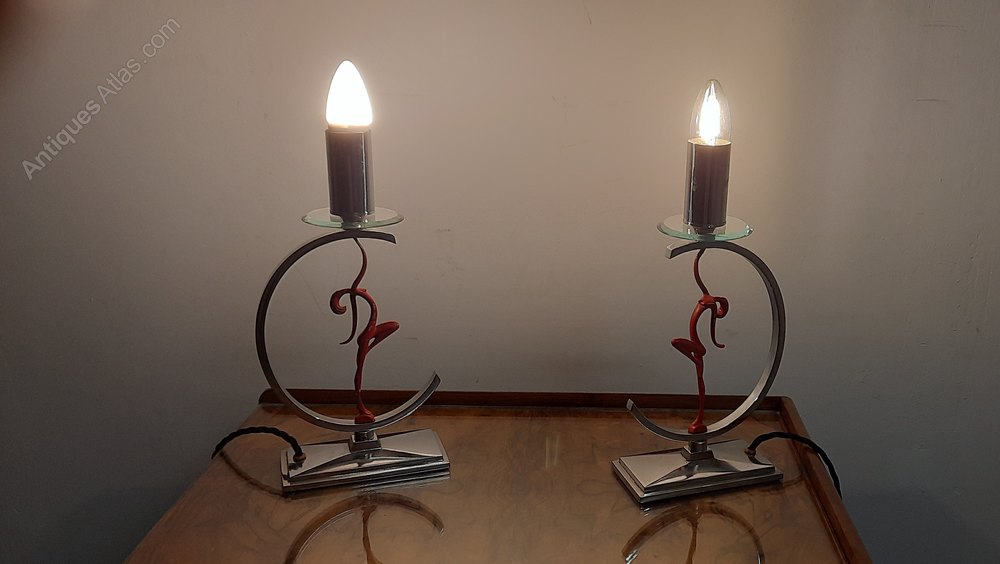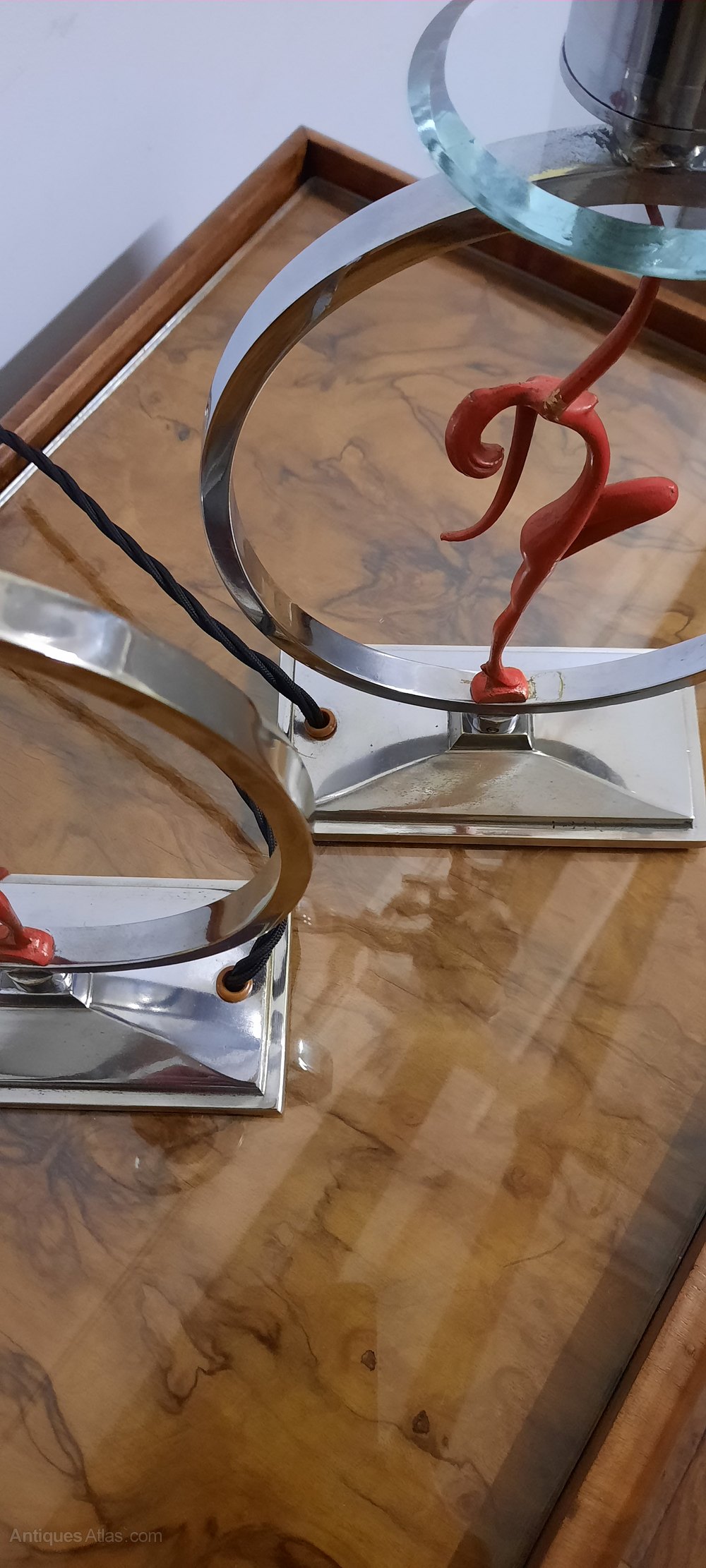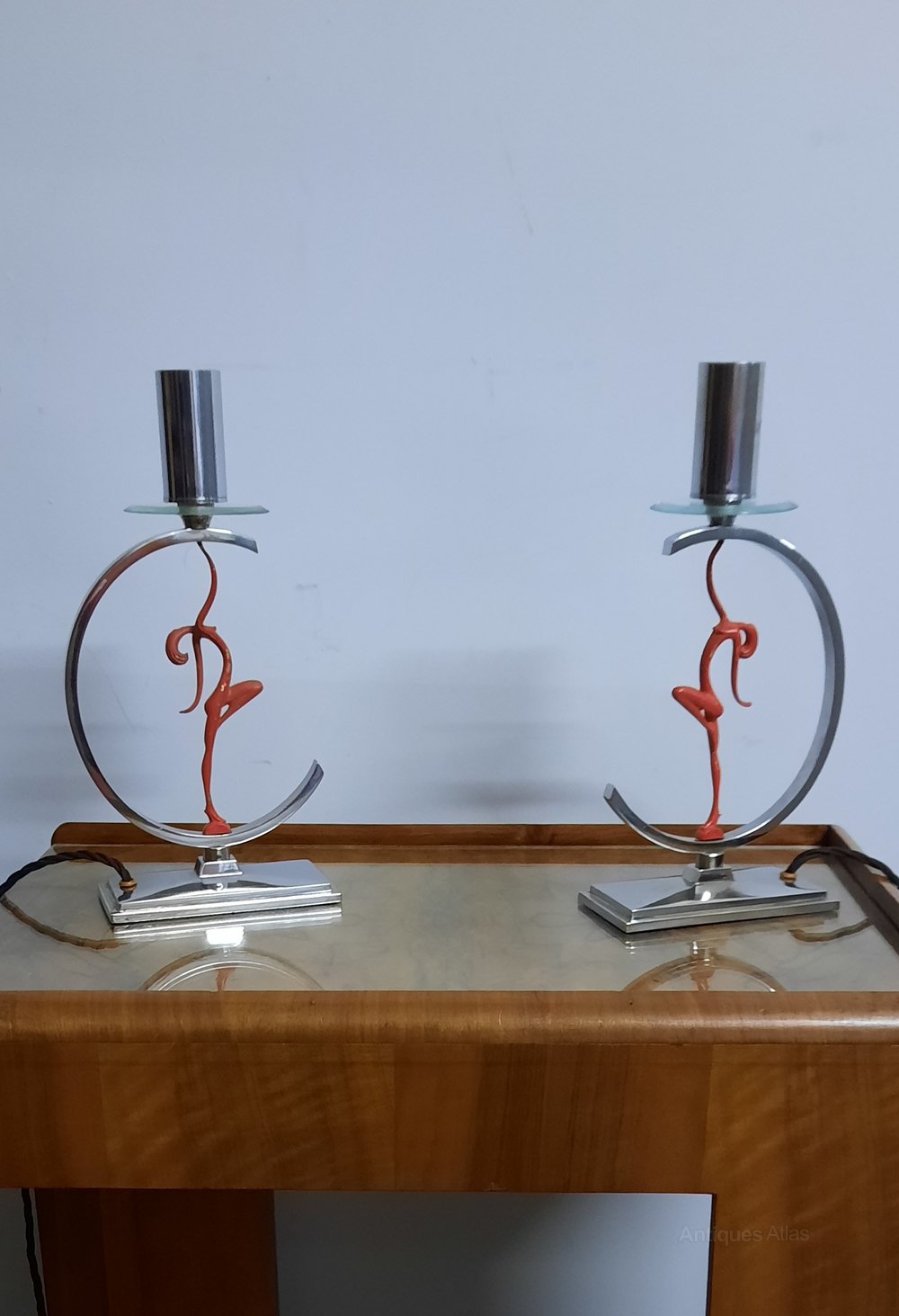 Wonderful pair English chromed lights with stylised brass figures in the style of Hagenhaur, Wien.