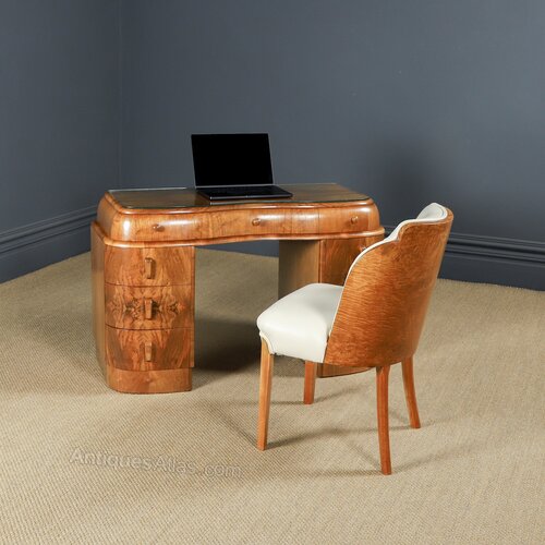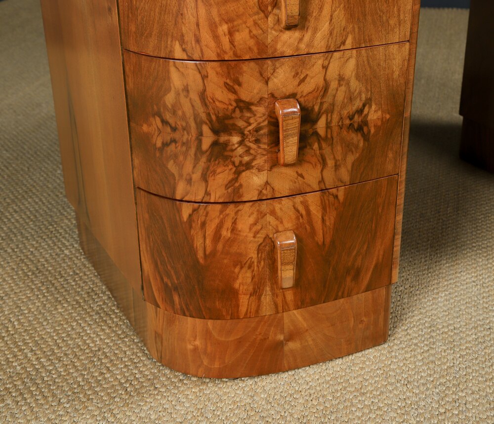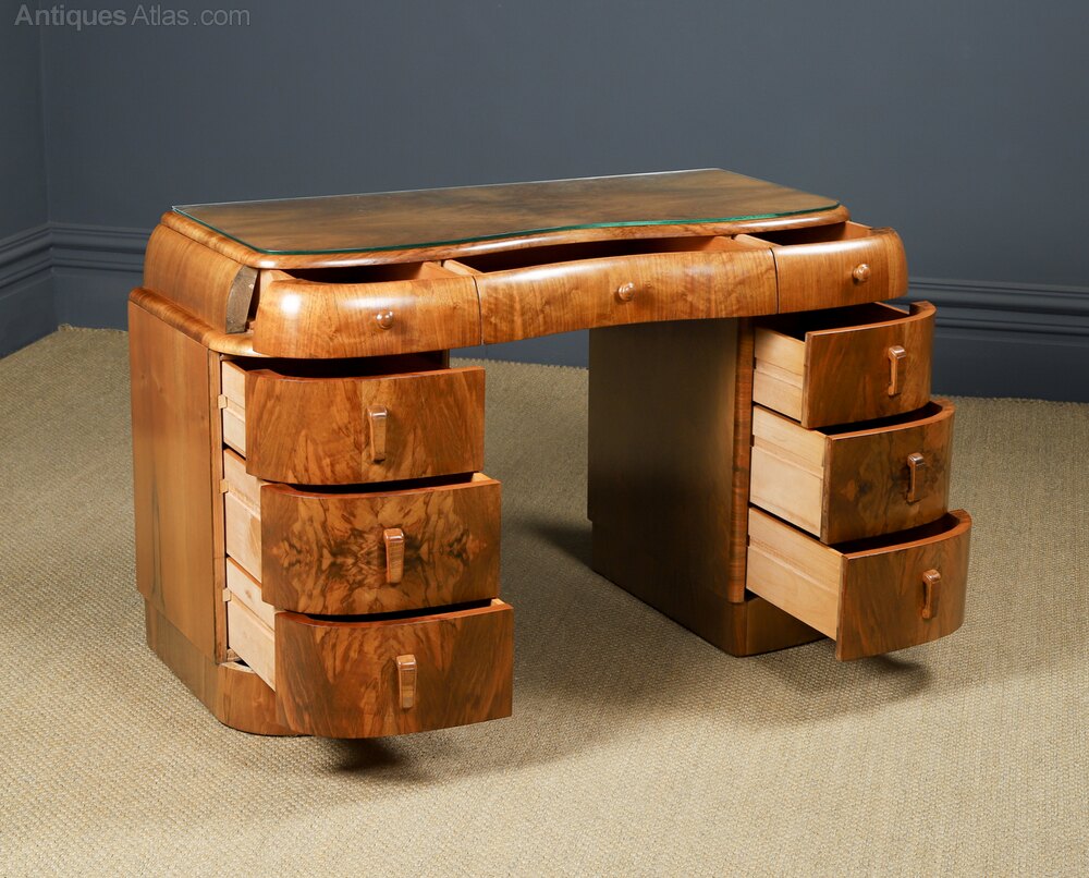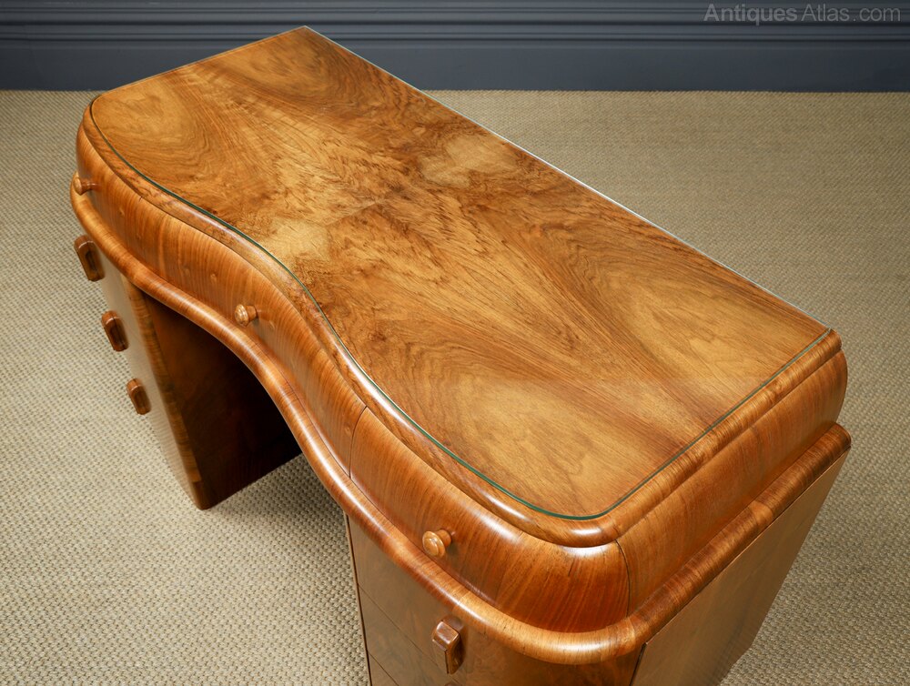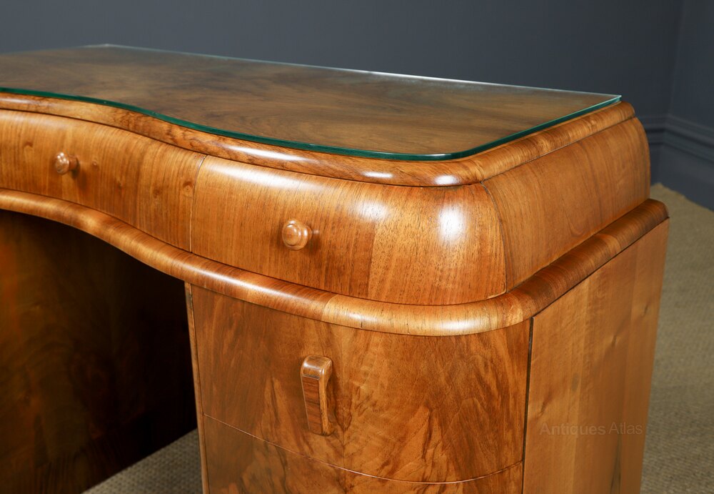 Condition This is a fine quality antique Art Deco pedestal desk, in figured walnut, with a cloud shaped design, incorporating a glass top, circa 1930, in excellent condition. The desk has been adapted from a dressing table. The Art Deco desk has been cleaned and French polished by hand, to a professional standard, in our workshop, therefore the colour and patination are of an excellent standard. Nominal old use marks to the leading edges and insides of drawers, but nothing significant considering the age of the item. There are no stains or scratches to the desktop. The drawers retain their original handles they are constructed with dovetail joints and close flush to the frame. This is a single piece Art Deco desk it does not dismantle into sections. The office desk This Art Deco desk is well constructed, solid in joint and ready to use.