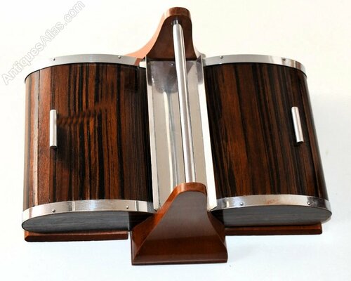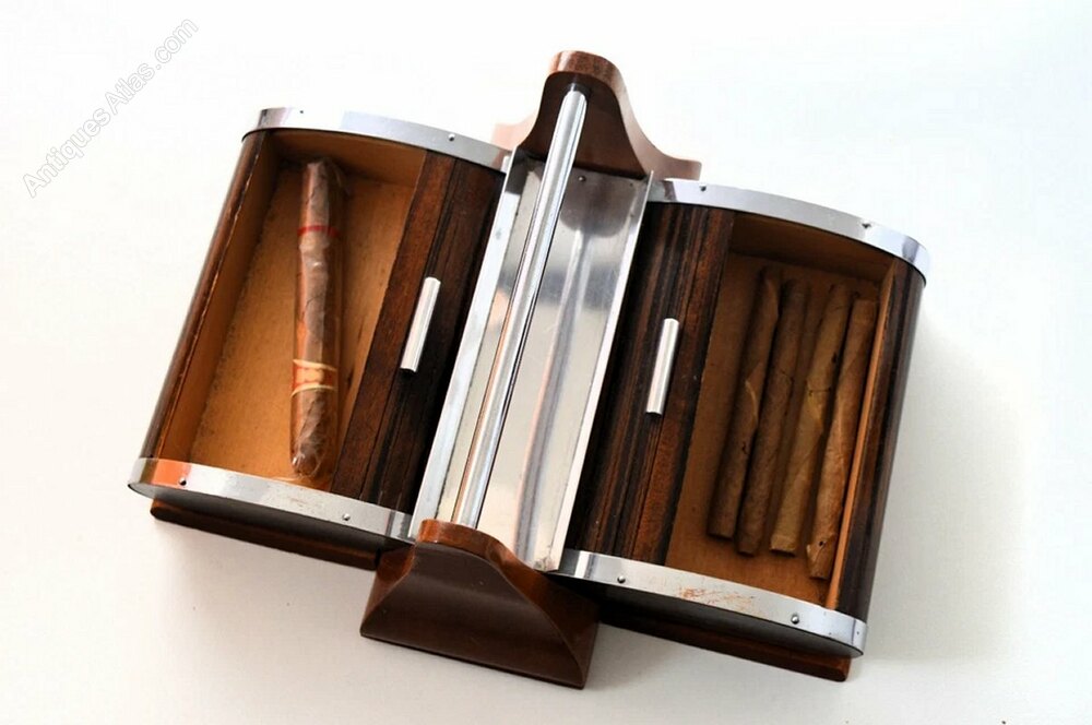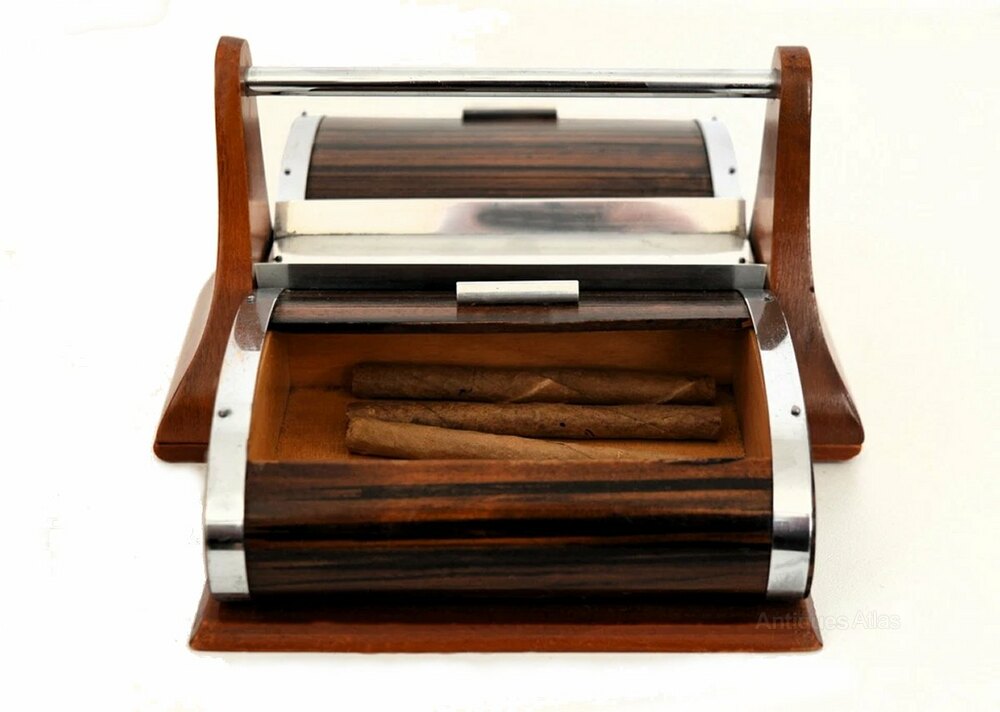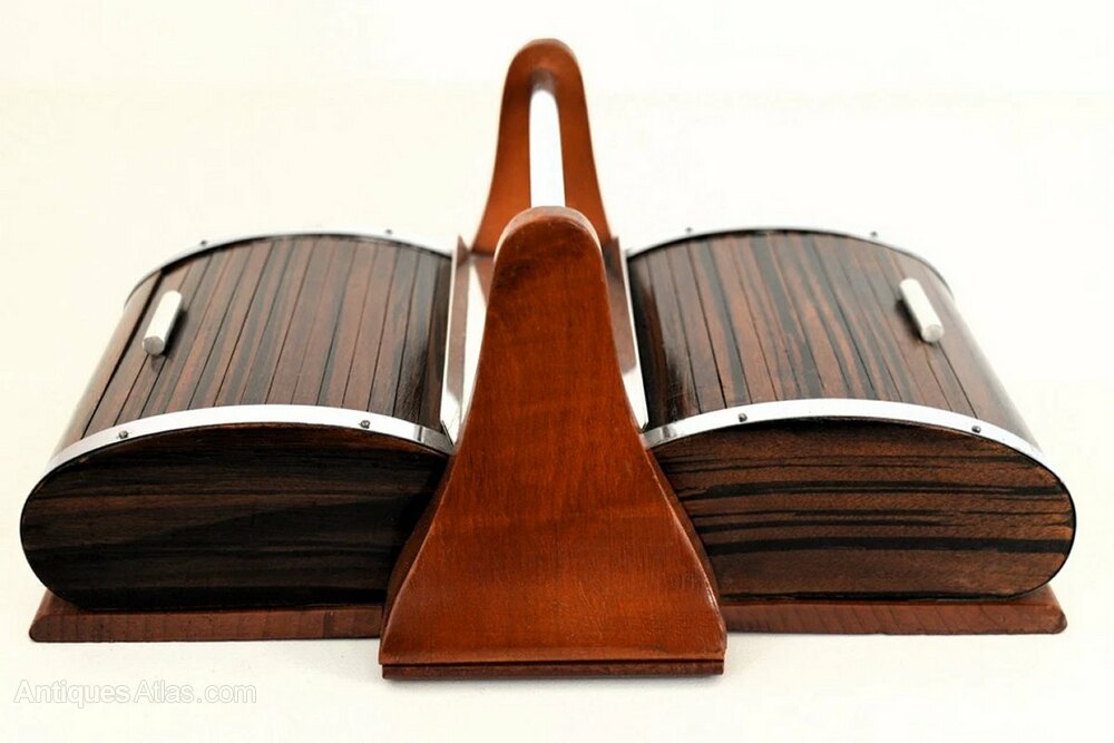 For your consideration is this superbly iconic Art Deco walnut cady. Features a pair of back-to-back roll top tambour style cigar boxes divided by a polished aluminium dividing 'shelf' are supported on a wooden base together with a central carrying handle. This box is a great size, larger than normal, making it a very functional piece, many possible uses such as antique jewellery, trinkets, writing, money, you decide.