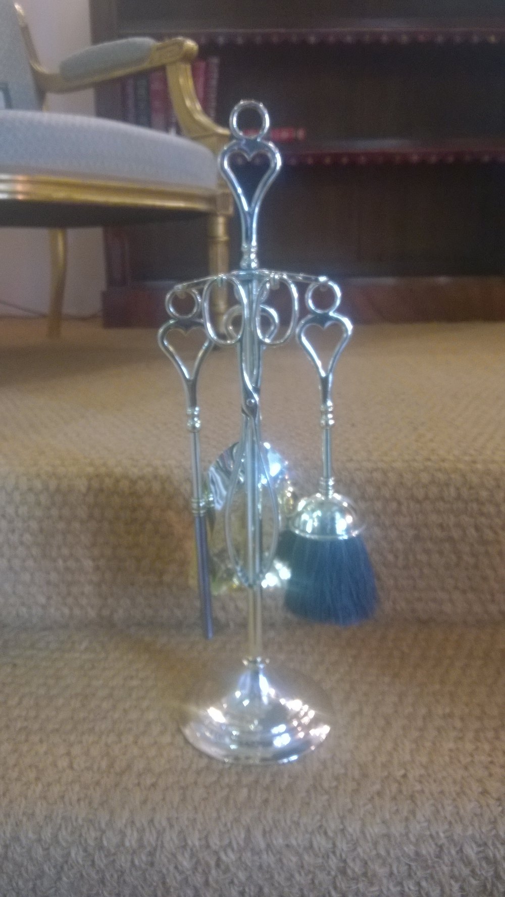 Art Nouveau Brass Companion Set with Heart Shaped Handles c1910 Comprising 3 Irons and Brush 5"d x 19"h