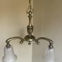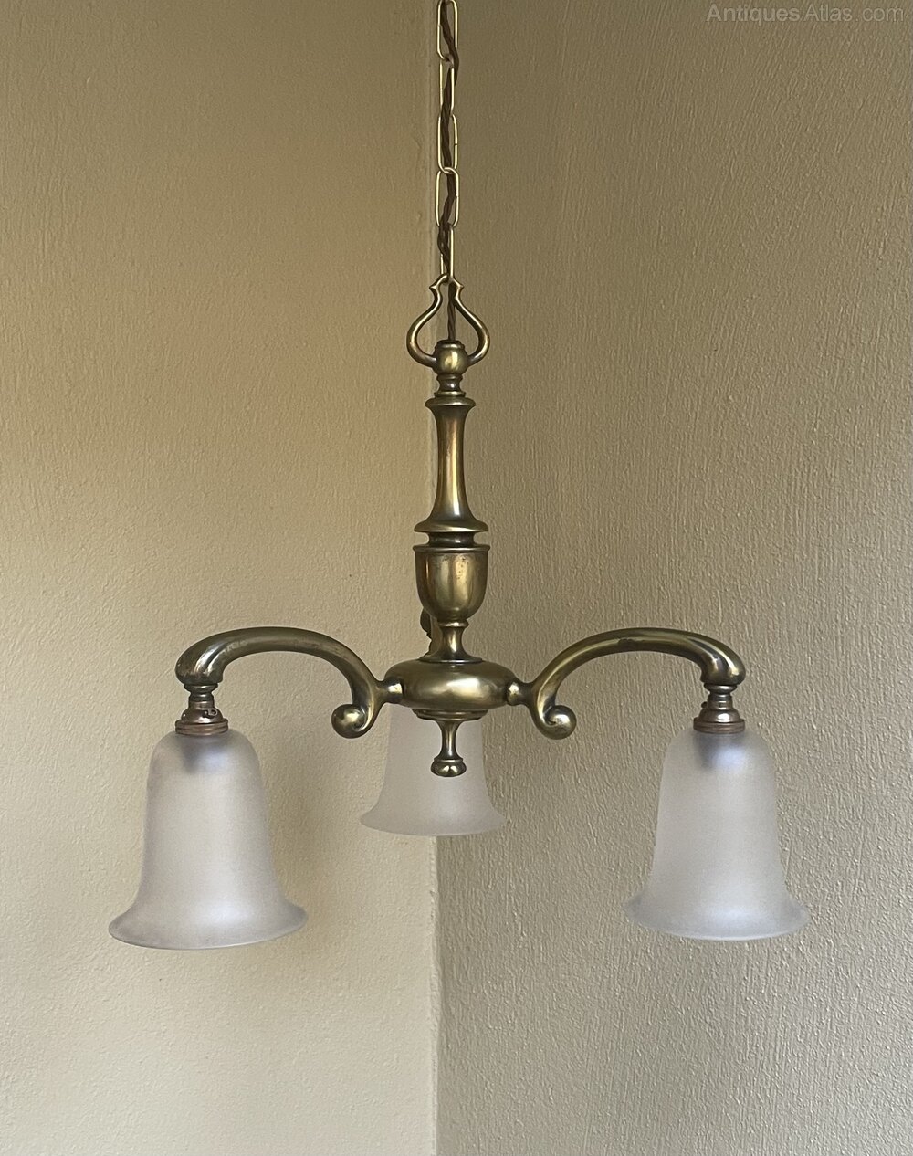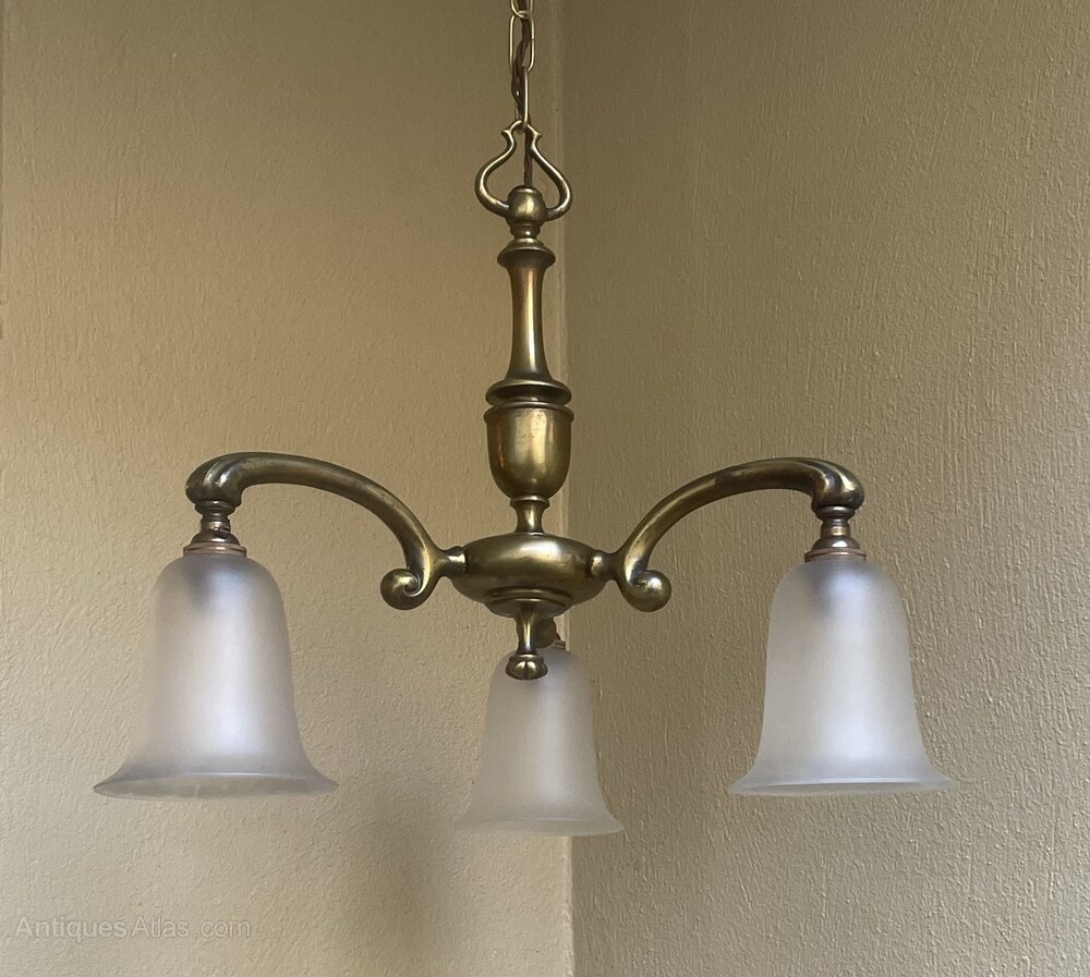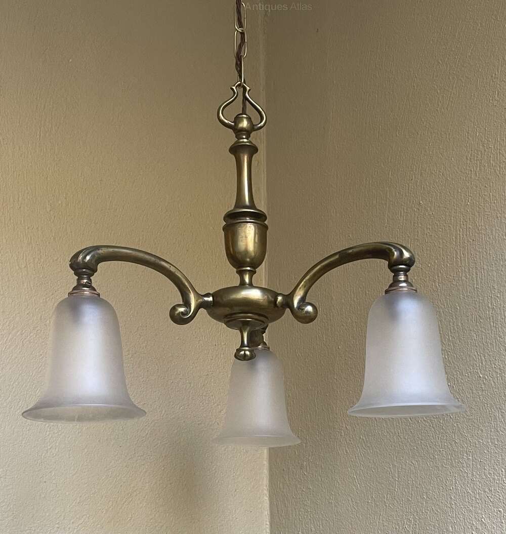 A good Art Nouveau patinated and gilded brass three light chandelier with original bell frosted shades. A simple yet elegant design very much in the style of Osler.