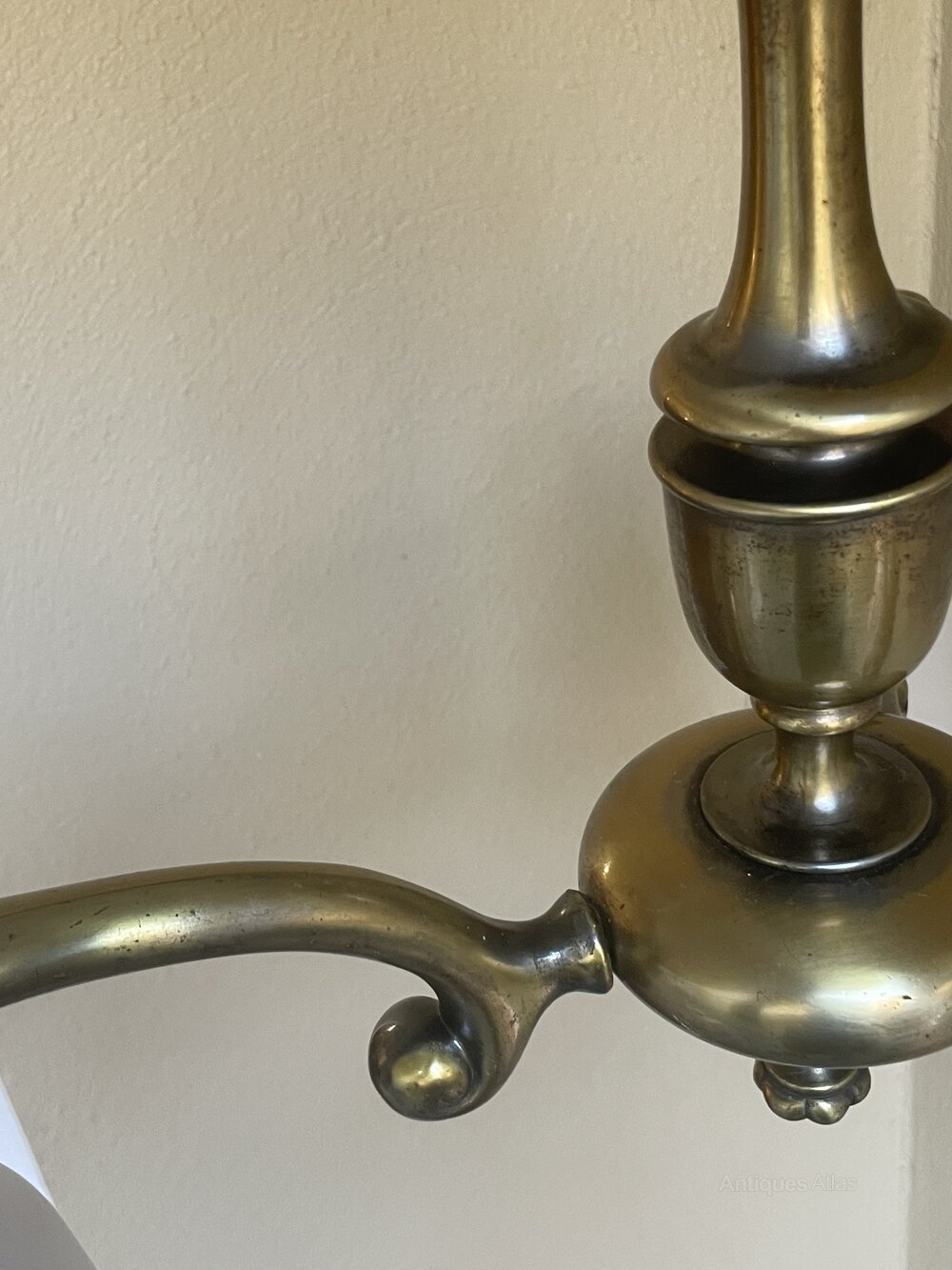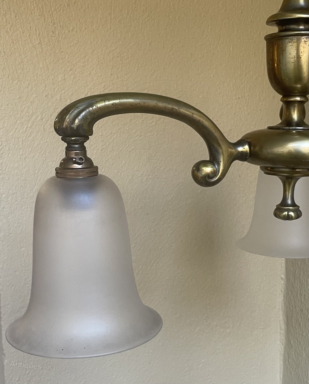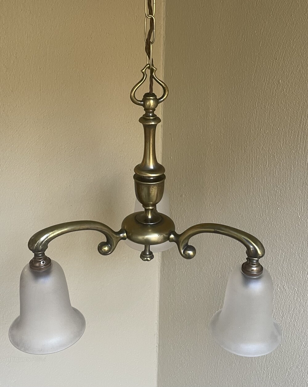 A good Art Nouveau patinated and gilded brass three light chandelier with original bell frosted shades. A simple yet elegant design very much in the style of Osler.