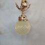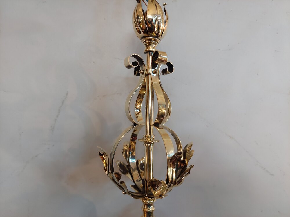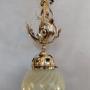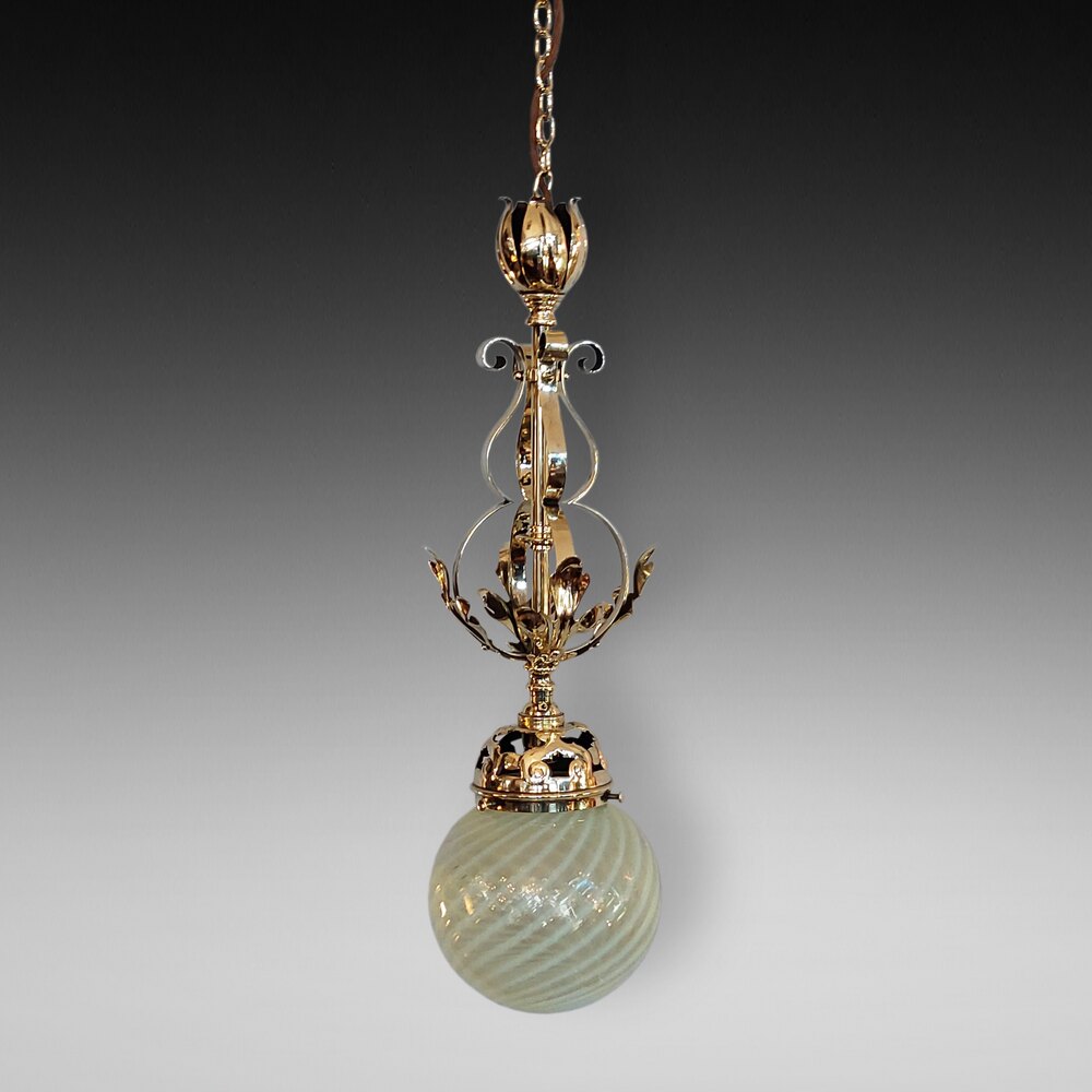 Art Nouveau Ceiling Lamp with Green Glass Bulb Cover supported on Brass Frame decorated with Tulip Leaves - 7"diam x 29"h - chain can be adjusted either way - all lights and lamps have been rewired with authentic corded flex, fitted with either foot switch or finger clicker switch and are Pat tested