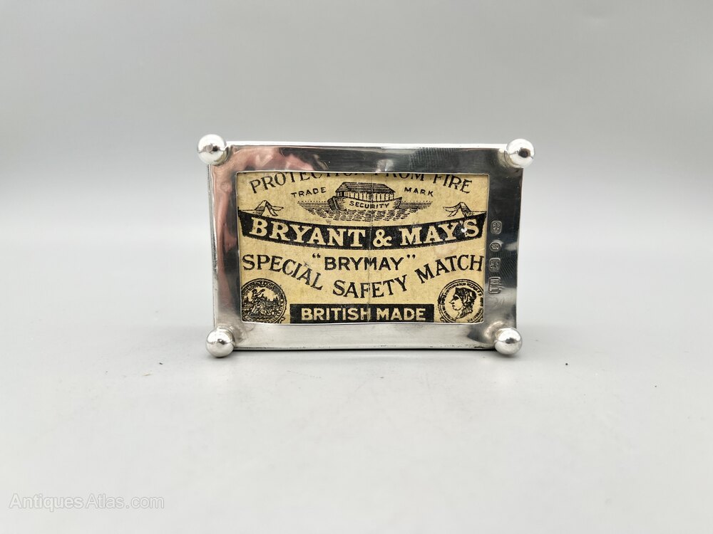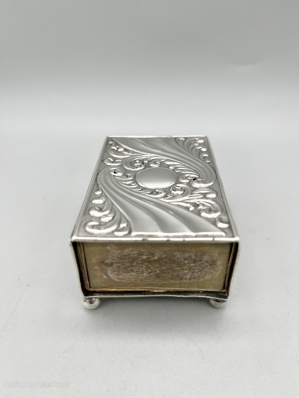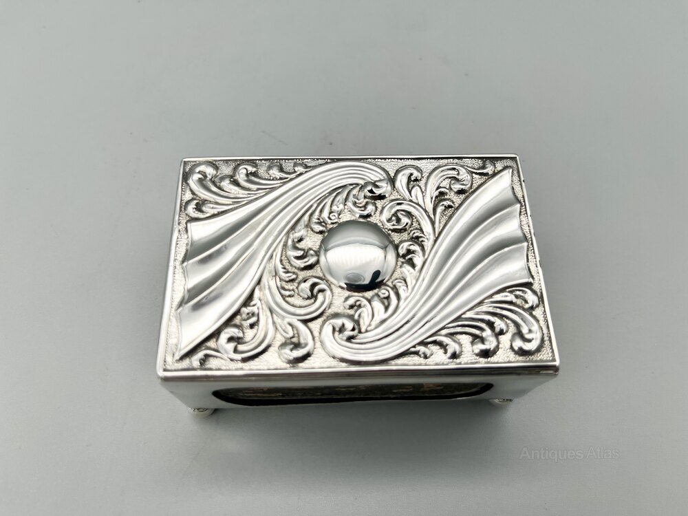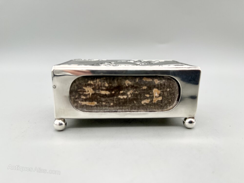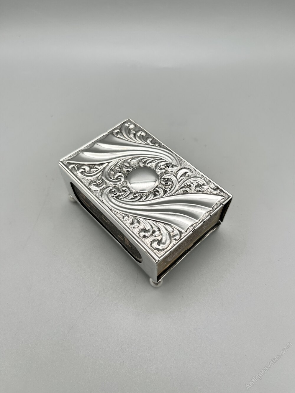 This is an elegant Art Nouveau Sterling Silver Matchbox Holder from the Victorian era. It has a period Bryant & May empty matchbox inside. The oblong holder stands on four ball feet and the top has an embossed design of sweeping organic shapes surrounded by foliage with a circular blank cartouche in the centre.