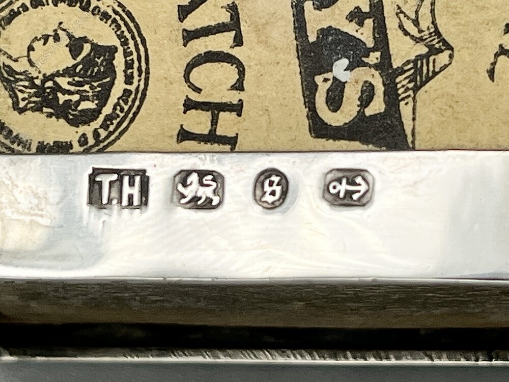 The matchbox holder was made in Birmingham by silversmith Thomas Hayes and dates to 1892. Thomas Hayes registered his first mark at Birmingham’s assay office in 1887 and operated from premises in Spencer Street in the Jewellery Quarter. The firm was also registered in Chester. He produced a wide range of tableware, homeware and personal items. The company remained in business, latterly as T Hayes & Co, up until around 1910.