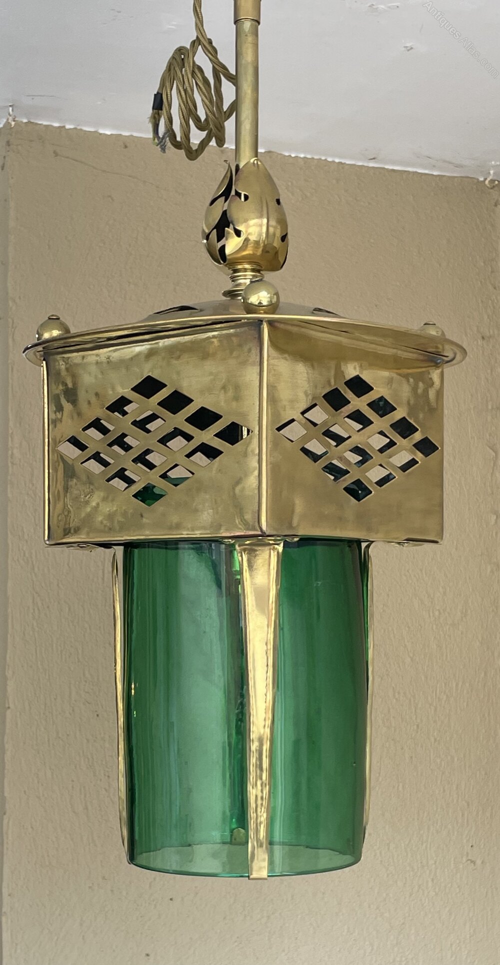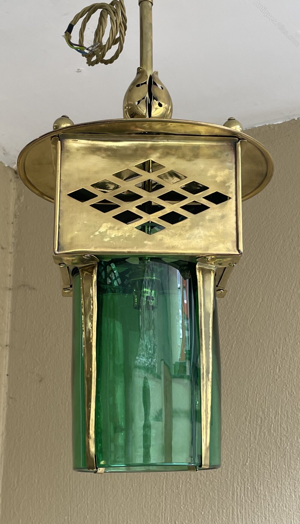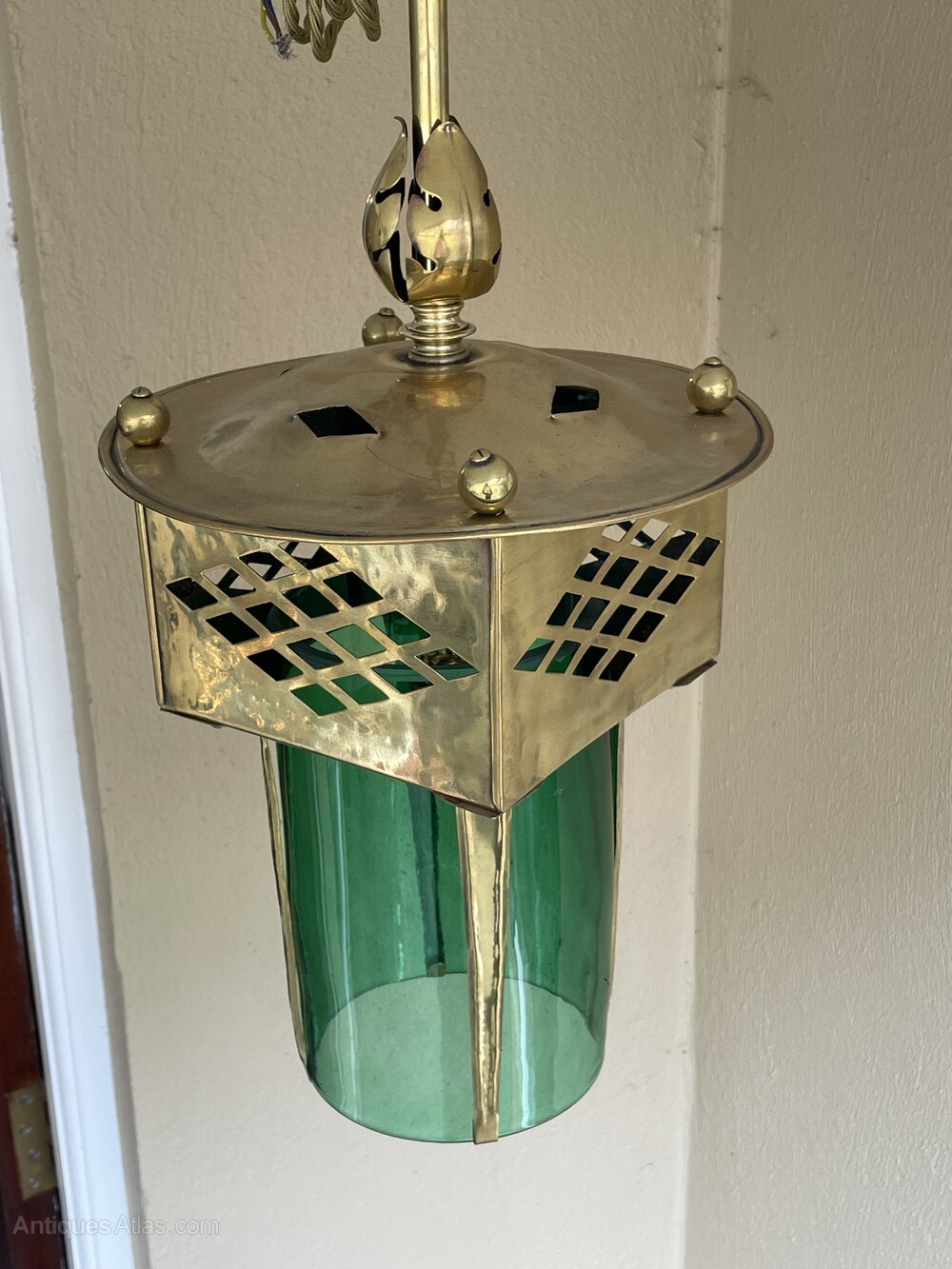 A good Arts & Crafts brass hall lantern of good scale and wonderful design, with pierced square top and beautiful hand made supports with heart detail supporting a replacement green glass shade.